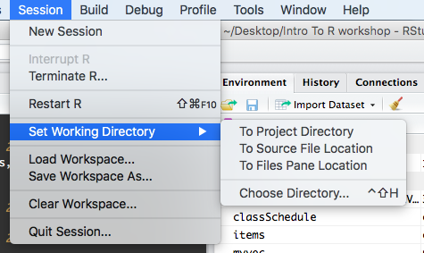 Alternatively you can go to the working directory and set the working directory using the files panel and clicking the gear wheel for “more” within RStudio.