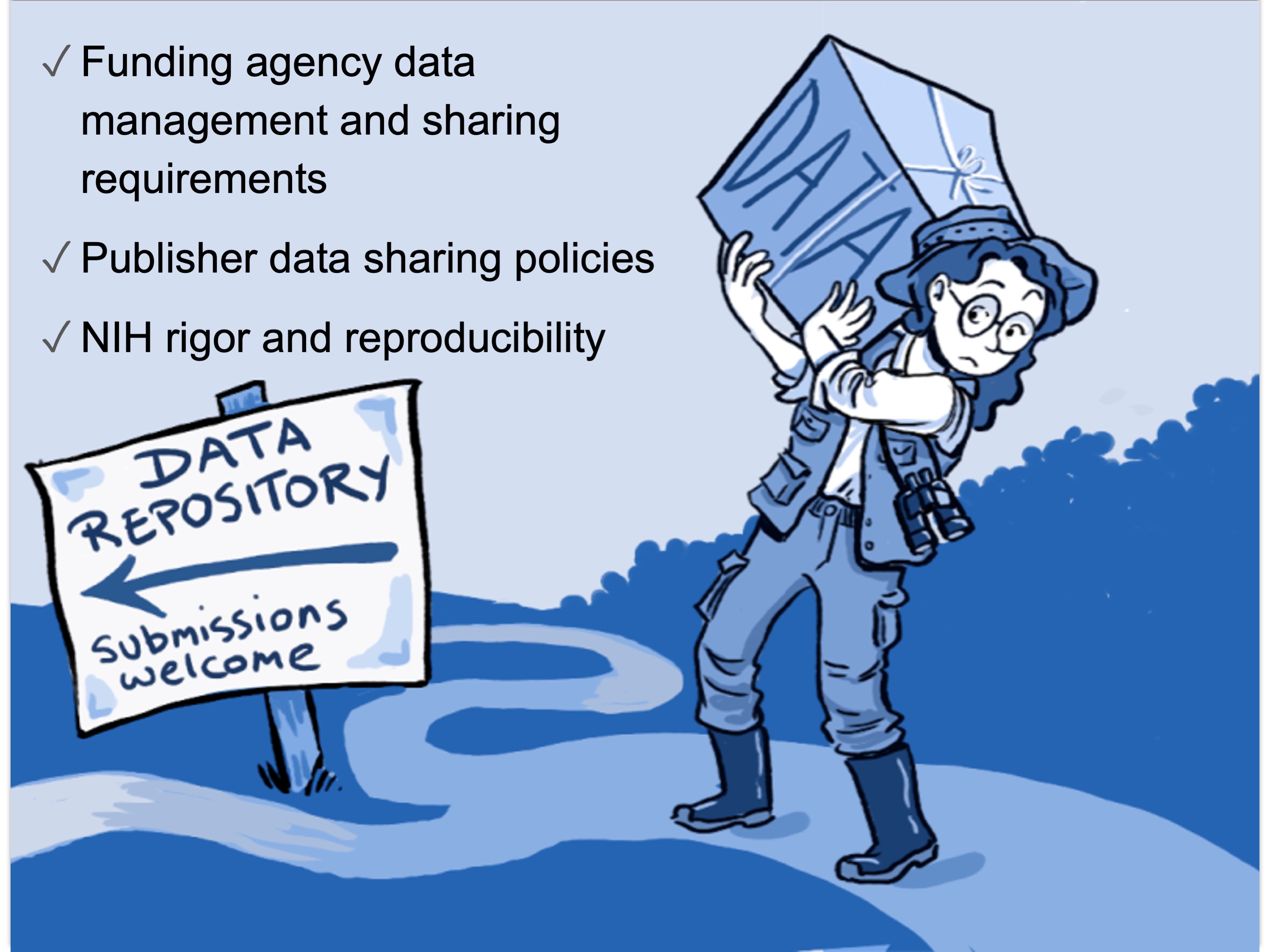 In the first place, if you have tried to apply for a grant recently, you may have noticed that some funders have required data sharing or data management plans as part of the grant. The NIH since 2003 has required a data sharing plan for grant applications requesting more than $500,000, and a new policy that applies to all research funded by the NIH will go into effect in 2023.