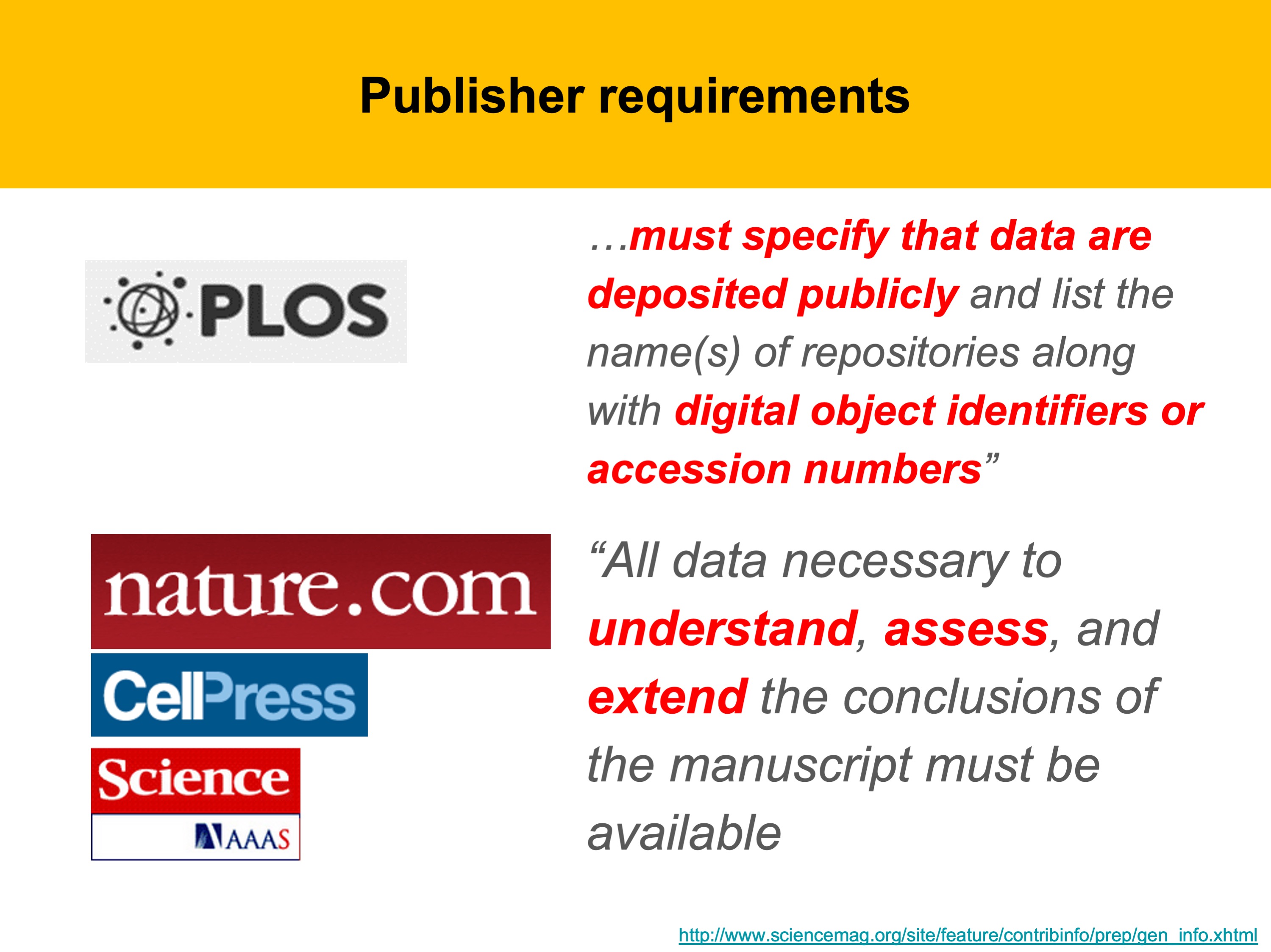 Other journals like Nature, Science, and Cell have language written into their policies stating that data necessary to understand and assess the conclusions of a manuscript must be shared.