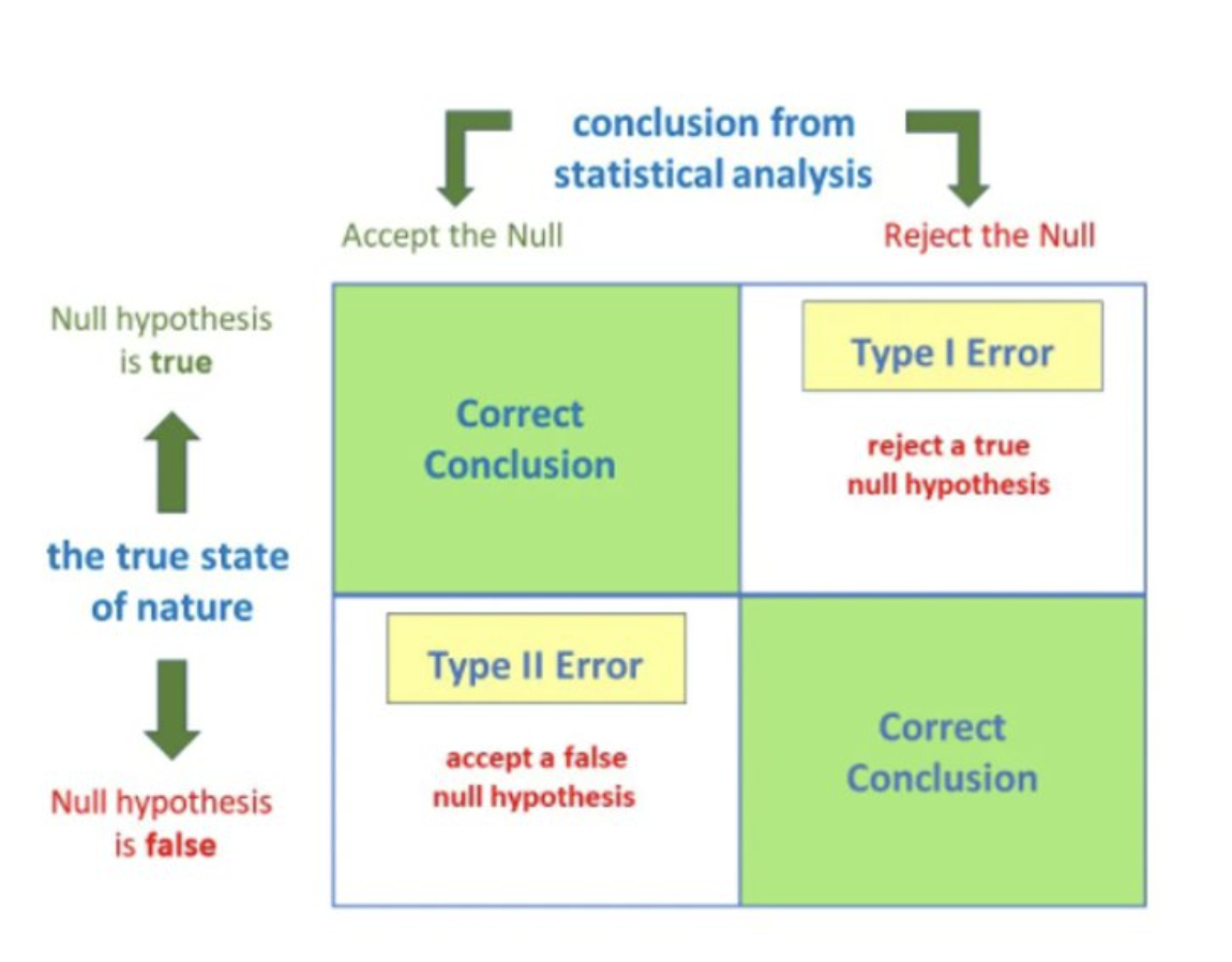 Type I error is the probability that you will wrongly reject the null hypothesis/wrongly accept the alternate hypothesis—this is also known as a false positive. p values (when calculated) or alpha values (when set a priori) represent the chance of committing a type I error. Social scientists tend to use an alpha of .05, but may set it lower to make a more compelling argument for their findings. For instance, if a researcher was to only accept that a finding is significant, and not due to random error or chance, at a alpha value of .01, their argument may be more compelling than if the alpha level were set to .05 or .10. Practically, this means that a finding (e.g., an educational method leads to significantly higher scores) will occur by chance in the general population at most 1/20 times at p < .05, 1/100 times at p < .01, and 1/10 times at p < .10.