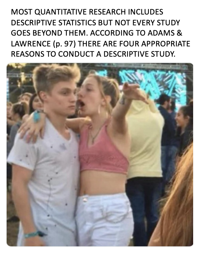 Which rationale for conducting a descriptive study applies to each research question? How might you expand descriptive examples to correlational or experimental research questions (based off of your current understanding)?