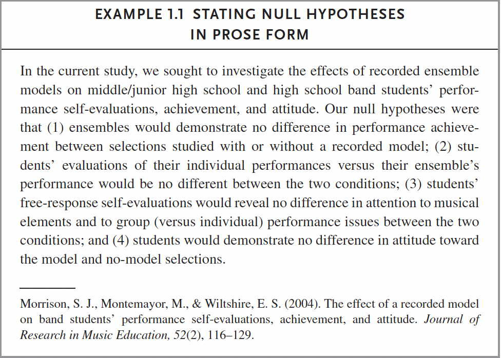 After formulating some hypothesis (e.g., there is no difference in the performance ability between 6th and 7th grade band students) we collect and interpret data to either accept or reject the null hypothesis (h0), or the post-positivistic assumption that there is no difference between 6th and 7th graders, and that the intention of the research conducted is to disprove that assumption.