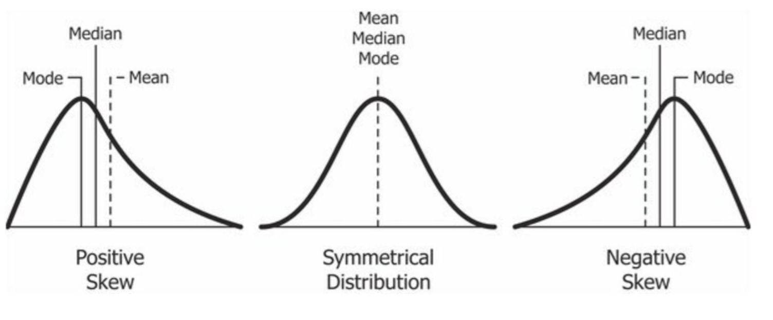 One helpful rule of thumb is that if the mean is greater than the median the distribution likely has a positive skew. Conversely, if the mean is less than the median, the distribution likely has a negative skew. See the figure below for an illustration of each distribution.