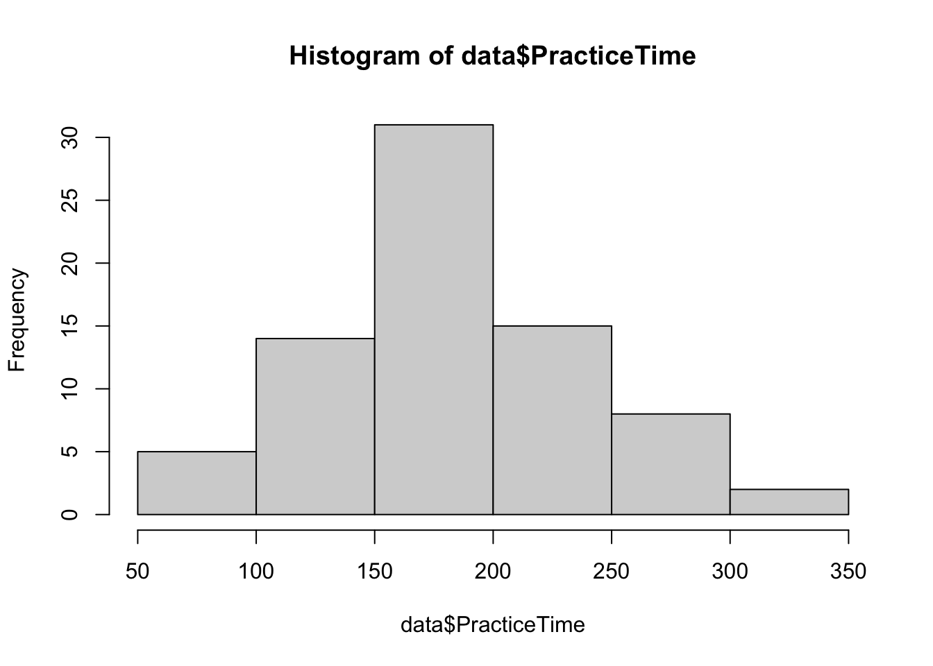 #View(data)Calculate the mean, median, range, standard deviation, and normality of the practice time variable.