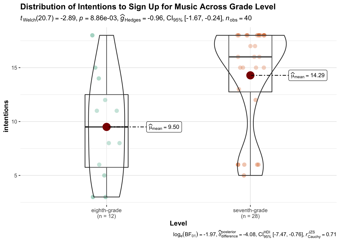 Violin plots can contextualize group differences found in data analysis. You may recall this example from Chapter 1. The red dot represents the mean of each group, and the gray horizontal line represents each median. These plots demonstrate that there is a statistical and practical significant difference in how seventh- and eighth-grade band and orchestra students in a United States sample are considering future elective music studies. The plot also indicates a potential ceiling effect for seventh-grade students, as many responded with the highest possible score. There are several other plots that tend to be utilized for illustrating group differences.