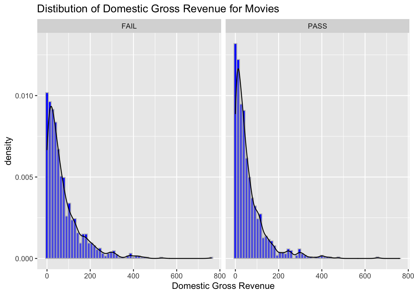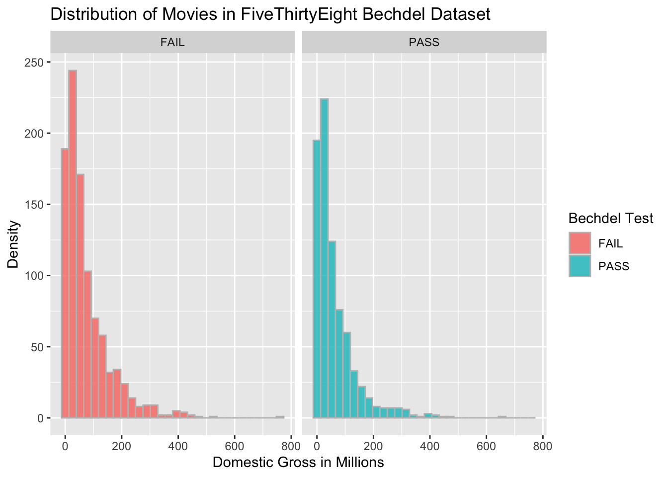 To exemplify this concept, we are going to start with data collected on Bechdel test. The Bechdel test measured the representation of women in 1,794 fictional films released between 1971 and 2013. Films that pass the Bechdel test would feature at least two women who talk to each other about something other than a man. Roughly half of films pass the test. The dataset also includes financial information, including the domestic and international earnings. The inclusion of these social and financial variables allows for some consideration of bias in the film industry.