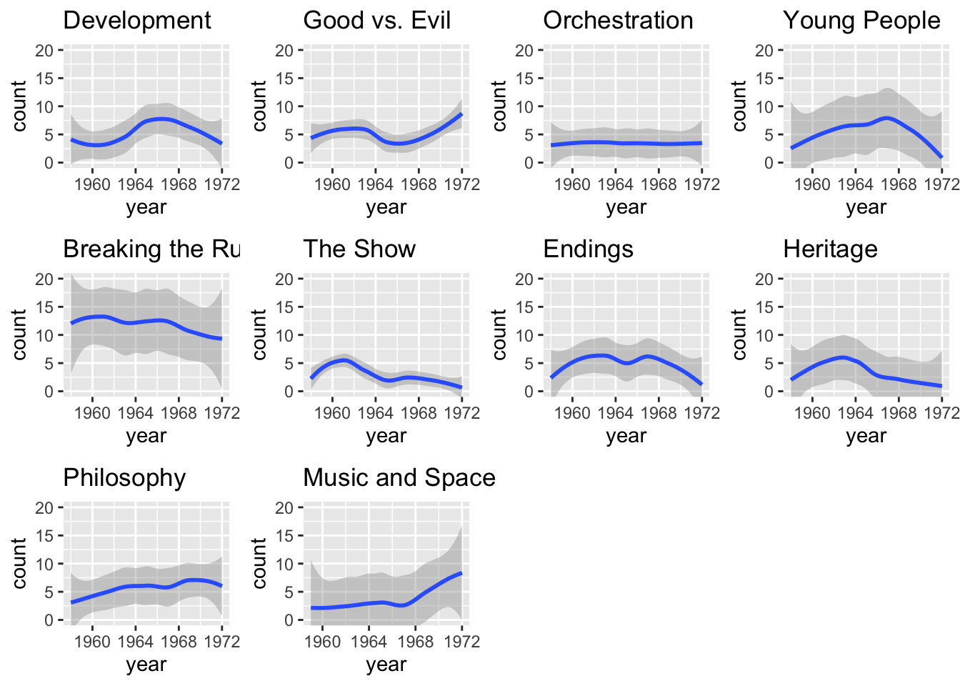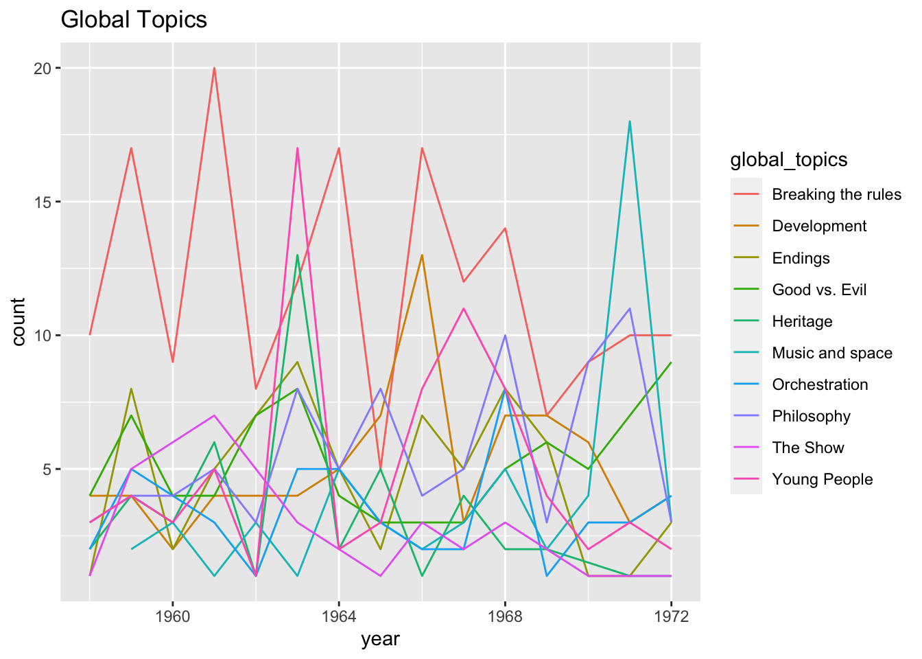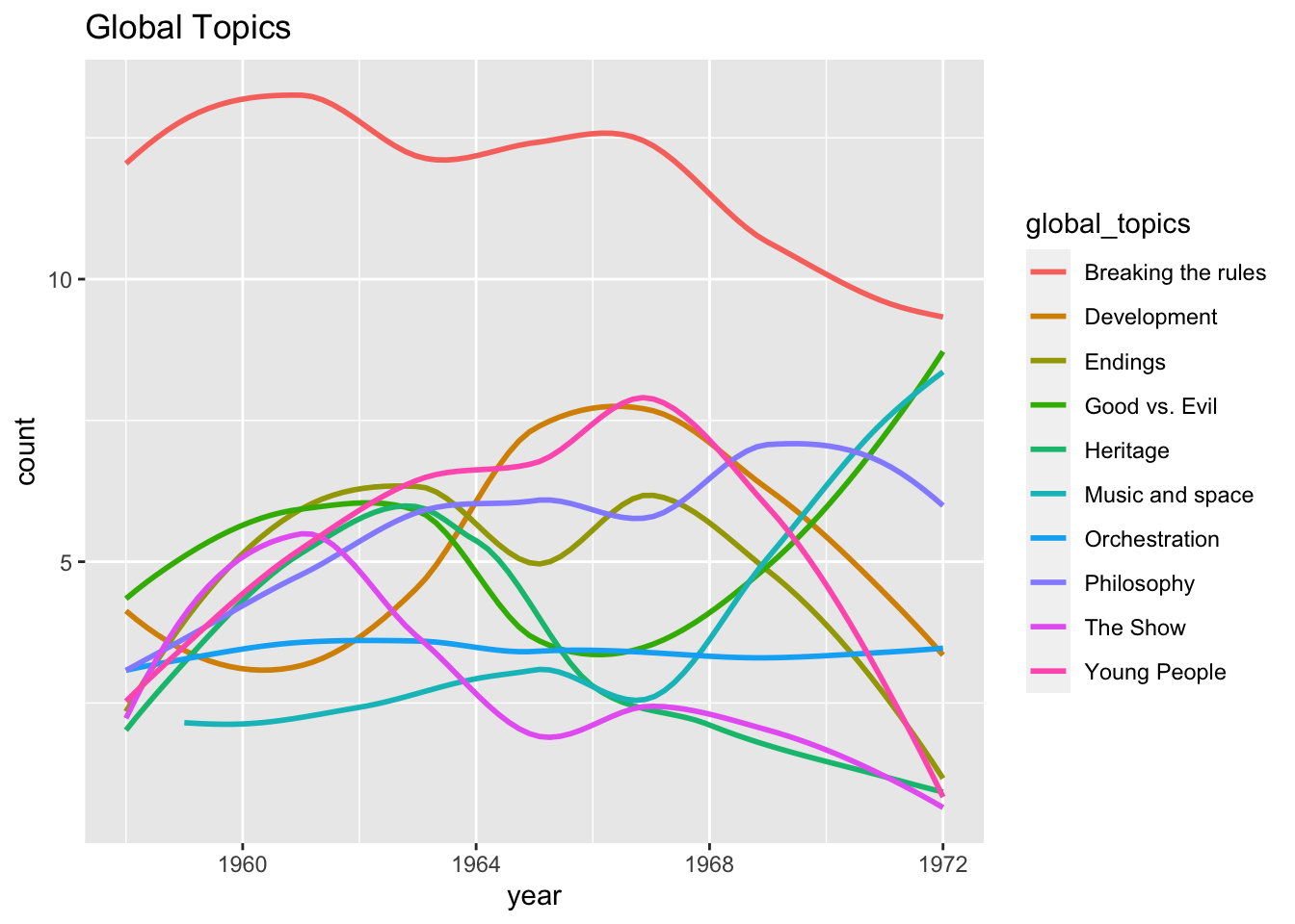 mutate(topics = factor(global_topics, levels=c("The Show", "Young People", "Music and space", "Philosophy", "Good vs. Evil", "Development", "Endings", "Heritage", "Breaking the rules", "Orchestration"))) %>%