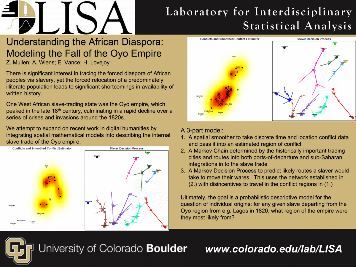 Mullen, Z., Wiens, A., Vance, E., & Lovejoy, H. (n.d.) Understanding the African diaspora: Modeling the fall of the Oyo empire. https://www.colorado.edu/lab/lisa/