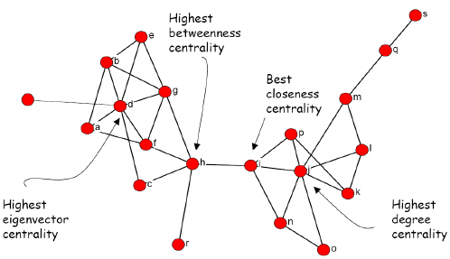 Degree Centrality: The degree of a node is the number of other nodes that single node is connected to. Important nodes tend to have more connections to other nodes. Highly connected nodes are interpreted to have high degree centrality.