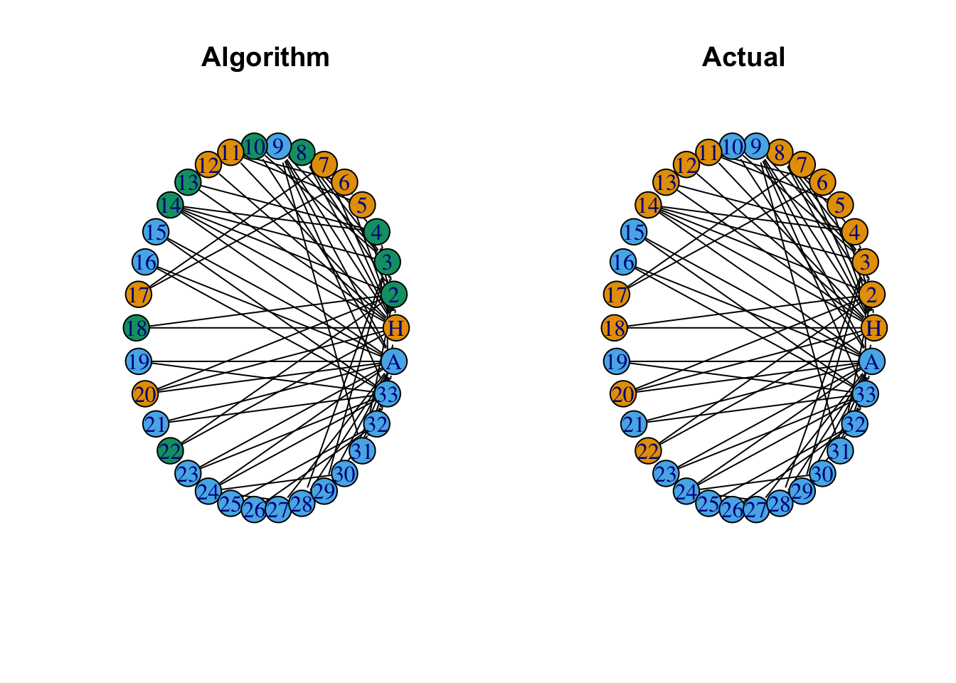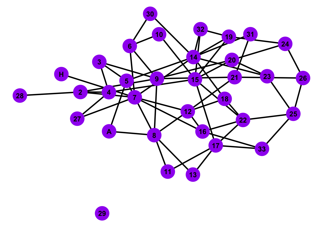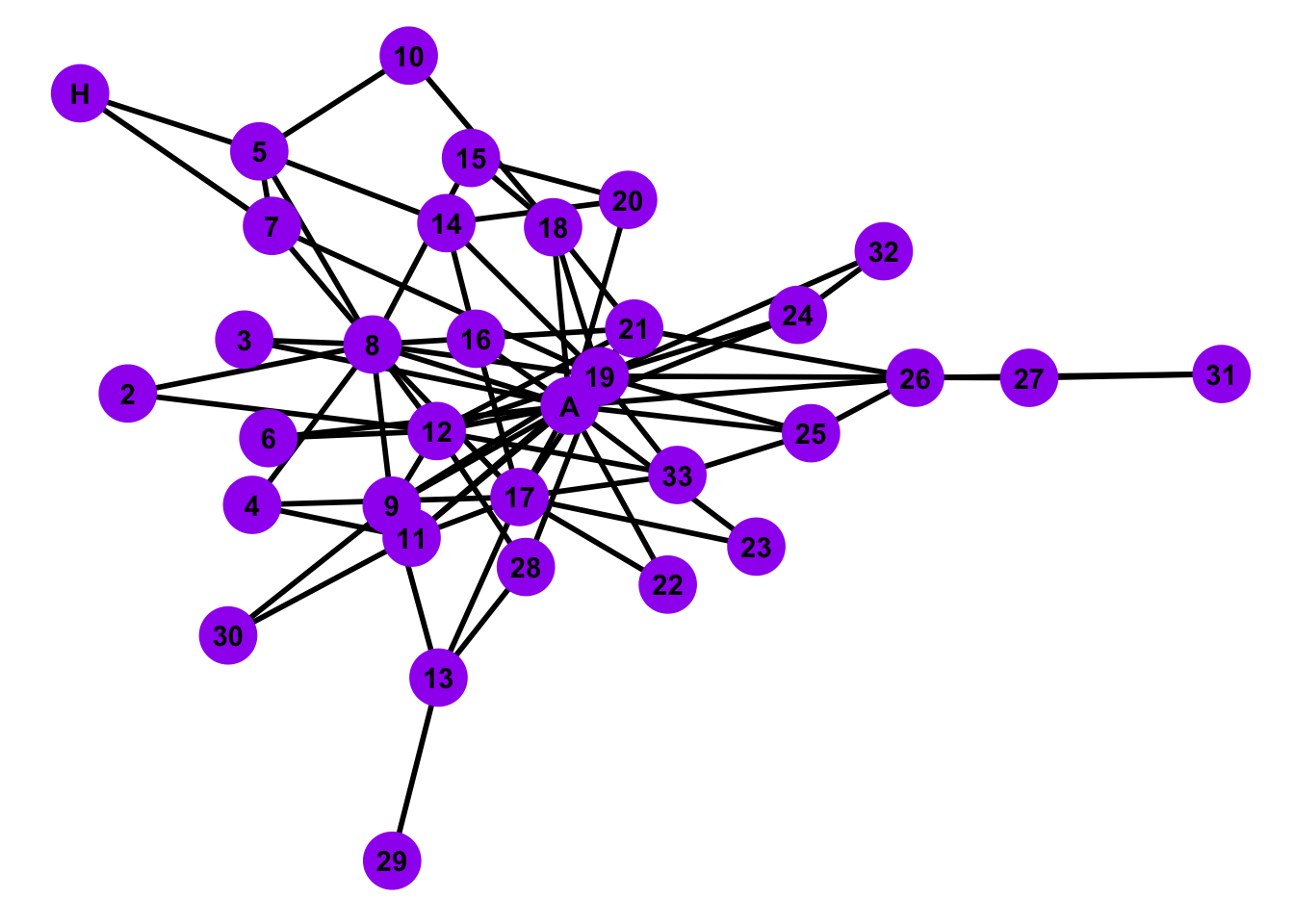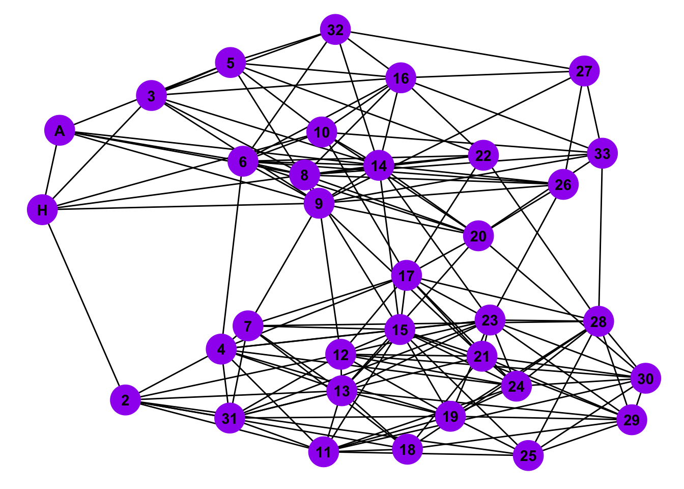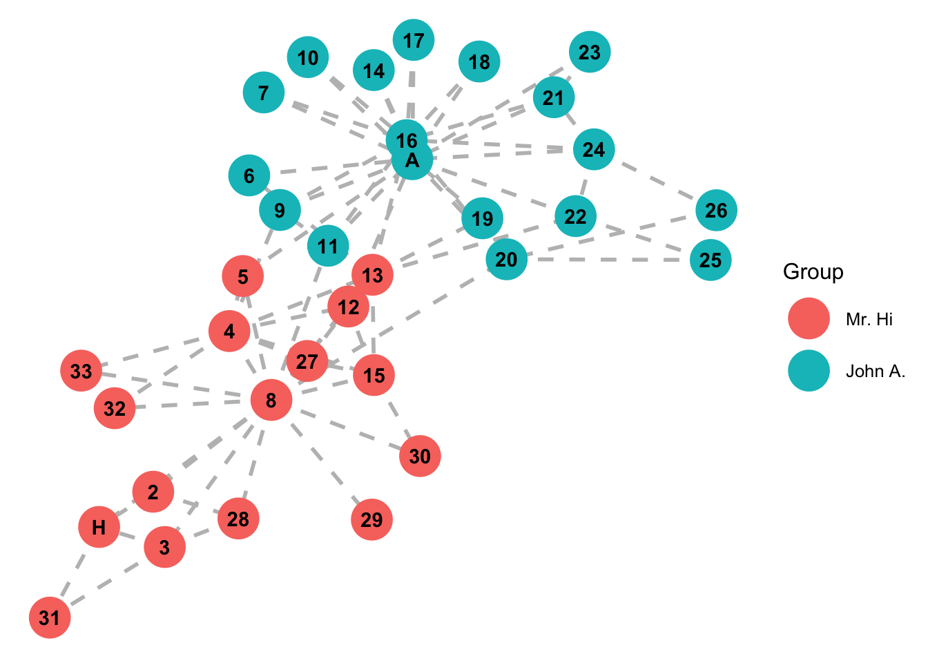 Taken from wikipedia: “A social network of a karate club was studied by Wayne W. Zachary for a period of three years from 1970 to 1972. The network captures 34 members of a karate club, documenting pairwise links between members who interacted outside the club. During the study a conflict arose between the administrator”John A” and instructor “Mr. Hi” (pseudonyms), which led to the split of the club into two. Half of the members formed a new club around Mr. Hi; members from the other group found a new instructor or gave up karate. Based on network analysis Zachary correctly predicted each member’s decision except member #9, who went with Mr. Hi instead of John A.” In this case study, we will try to infer/predict the group splits with network analysis techniques.