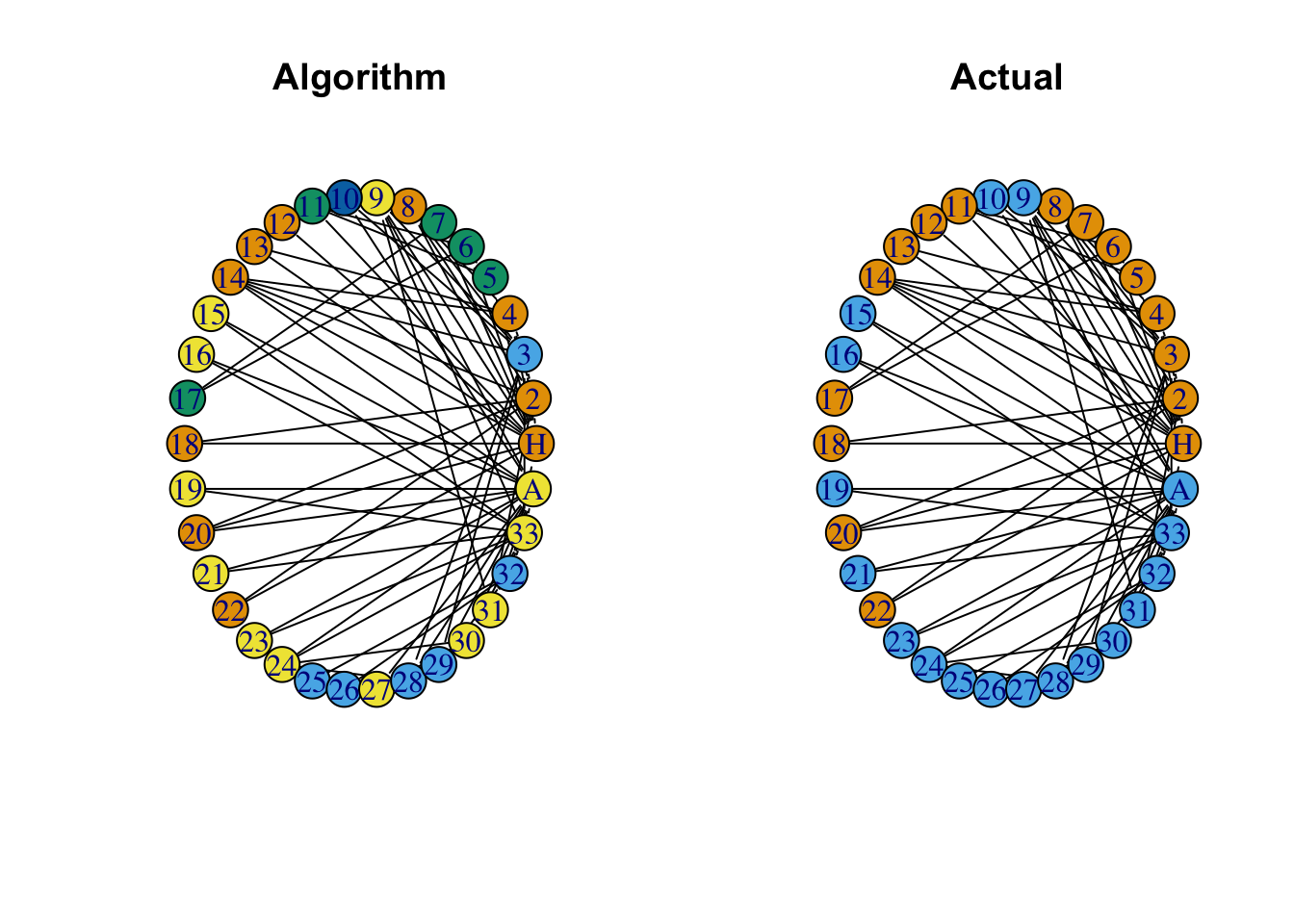 plot(G, vertex.color = groups, # Changes node color