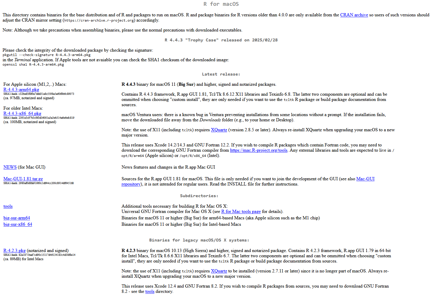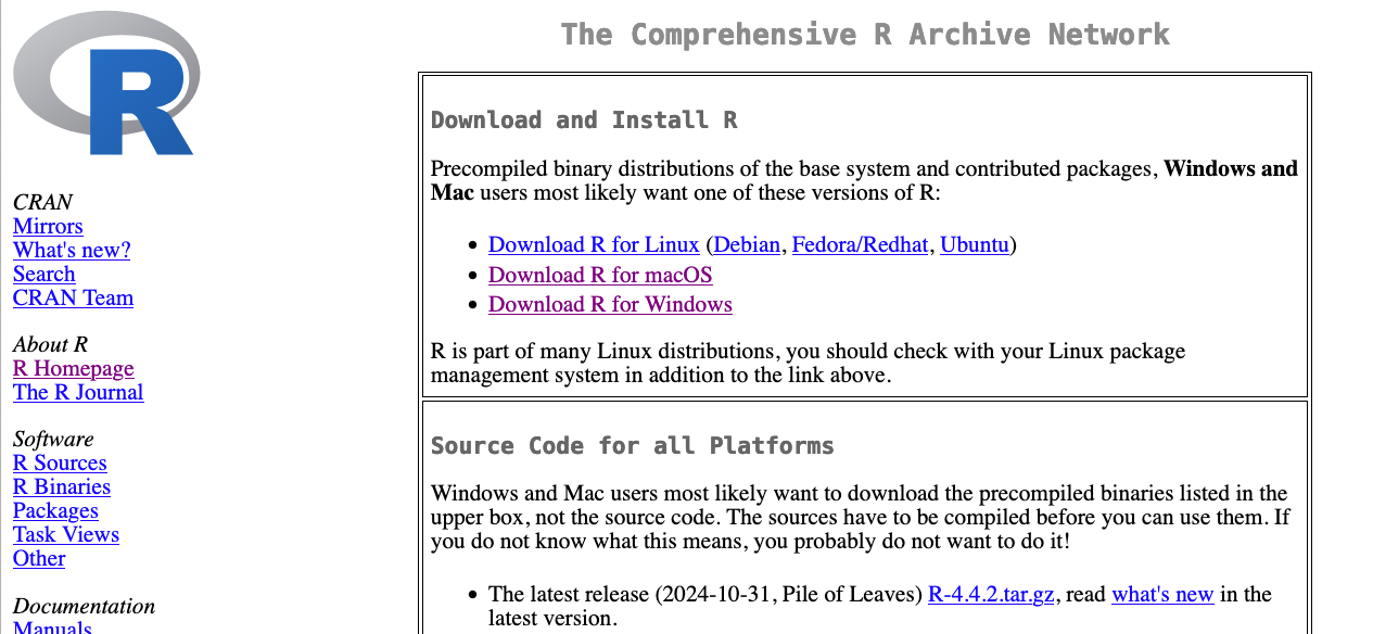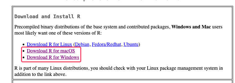 2.1.0.2 Väl på denna sidan, välj R för det operativsystem som du har på din dator, antingen Windows eller macOS, genom att klicka på någon av länkarna.