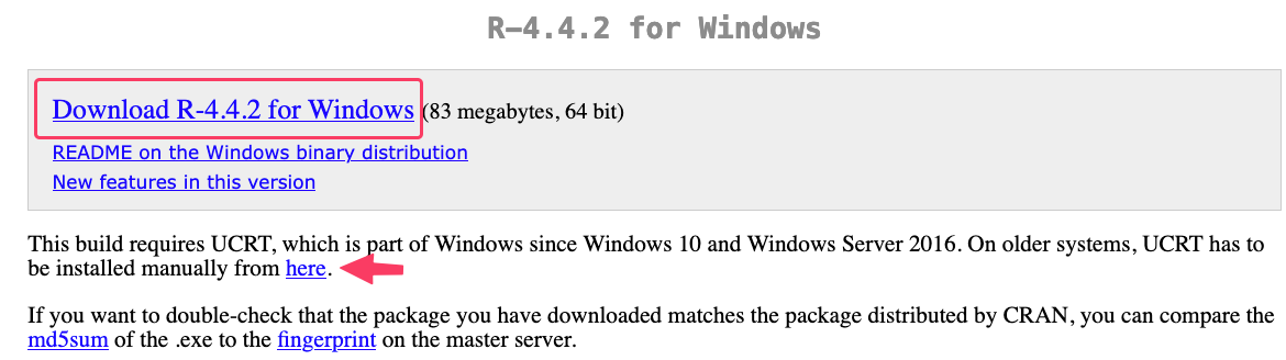 2.1.0.4 Fortsätt processen genom att klicka “Download R-X.X.X for Windows” (Obs! Ladda helt enkelt ned den version som är tillgänlig, i skrivande stund är detta R-4.4.3):