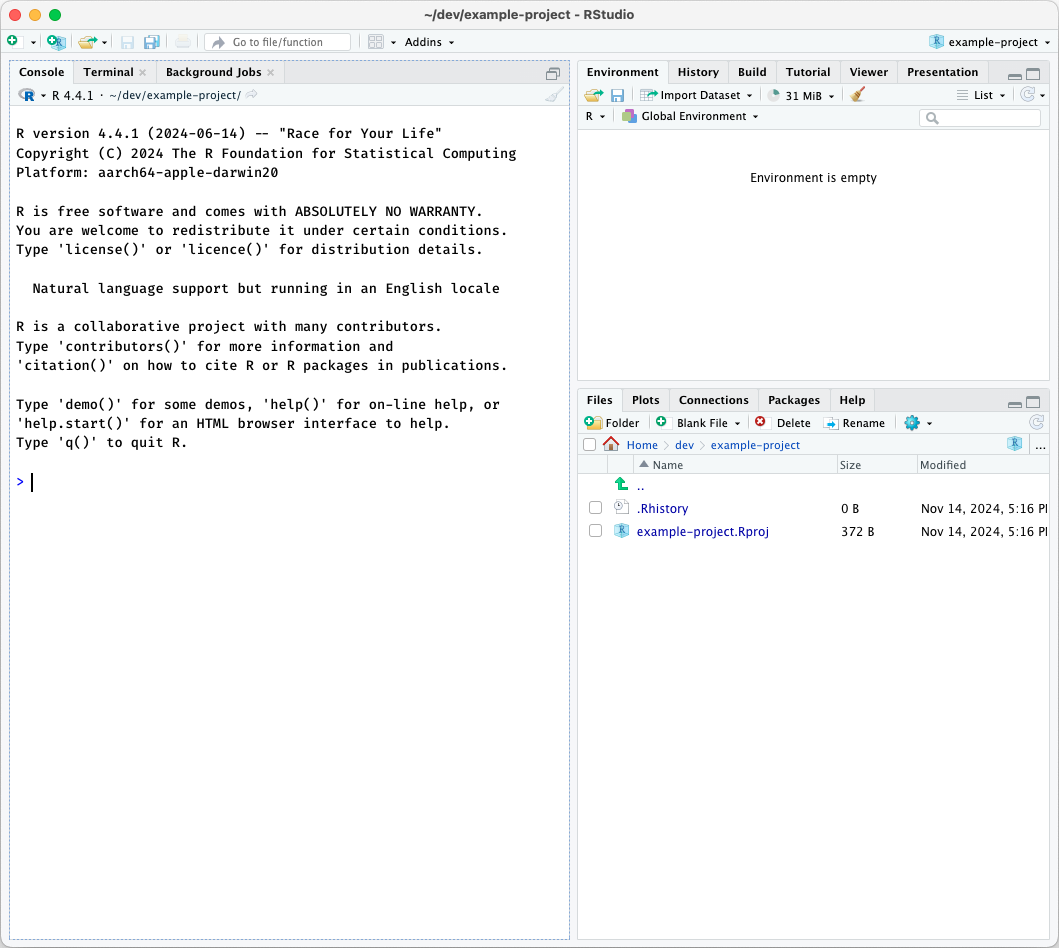 RStudio är en så kallad “Integrated Development Environment” eller IDE. Det är helt enkelt ett program som låter oss skriva kommandon i R och få statistiska beräkningar tillbaka, samlade på ett och samma ställe.