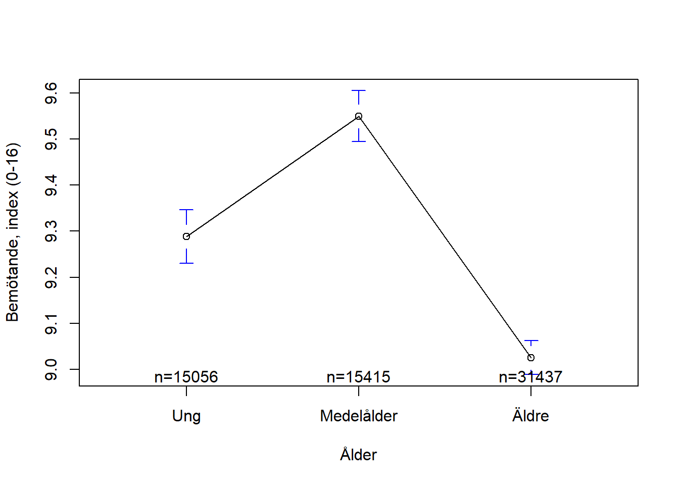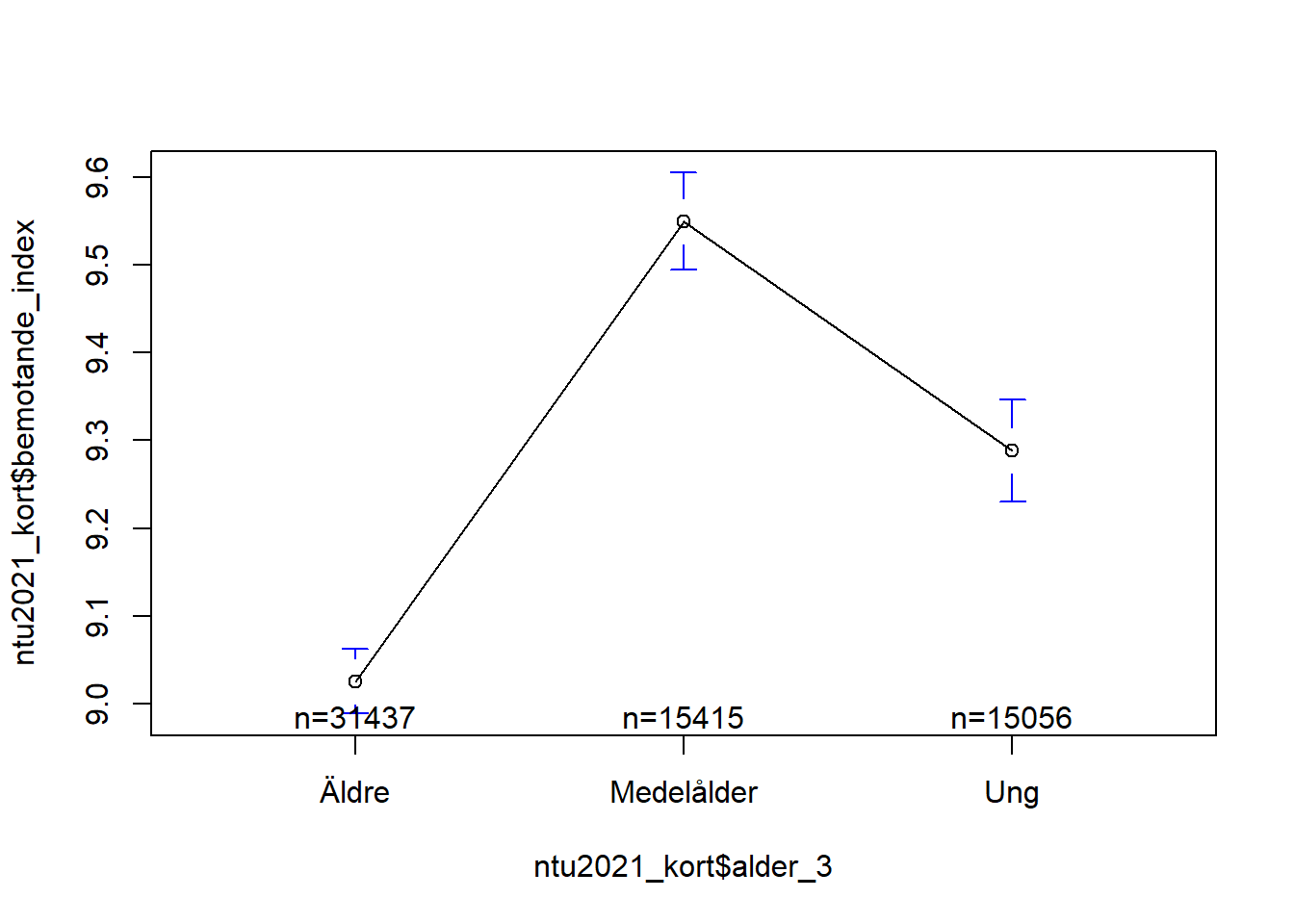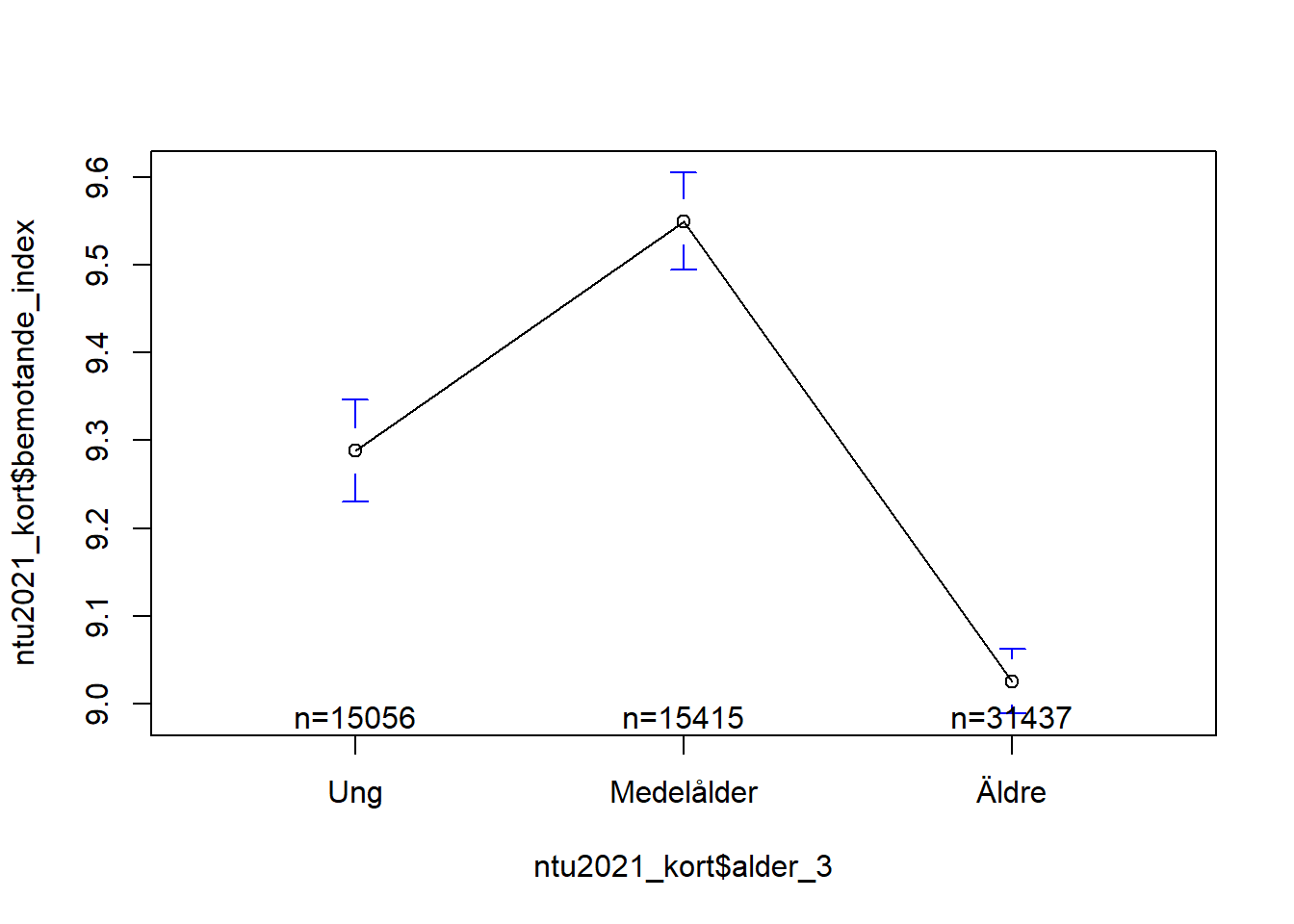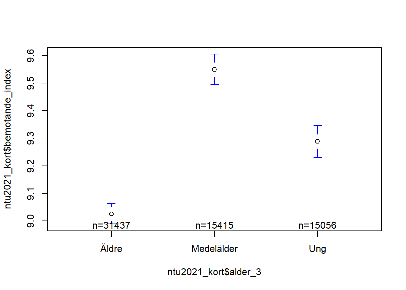 Här kan vi se en ganska tydlig medelvärdesskillnad mellan åldersgrupperna. Ringarna (o) representerar respektive medelvärde. De små morrhåren runt |-o-| runt dessa ringar representerar ett konfidensintervall om 95%. “n = XXXXX” står för antalet observationer inom de olika kategorierna.