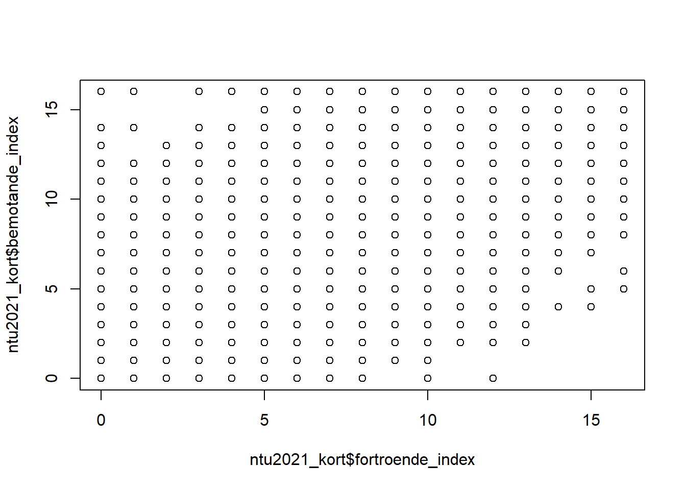 Om vi exempelvis vill se hur våra två typer av förtroende förhåller sig till varandra (det generella förtroendet för att rättsväsendet gör ett bra arbete mätt genom ntu2021_kort$fortroende_index och det lite mer specifika indexet som mäter förtroende för att rättsväsendet behandlar misstänka och offer rättvist ntu2021_kort$bemotande_index, hur dessa förhåller sig till varandra) så kan vi skriva följande kod: