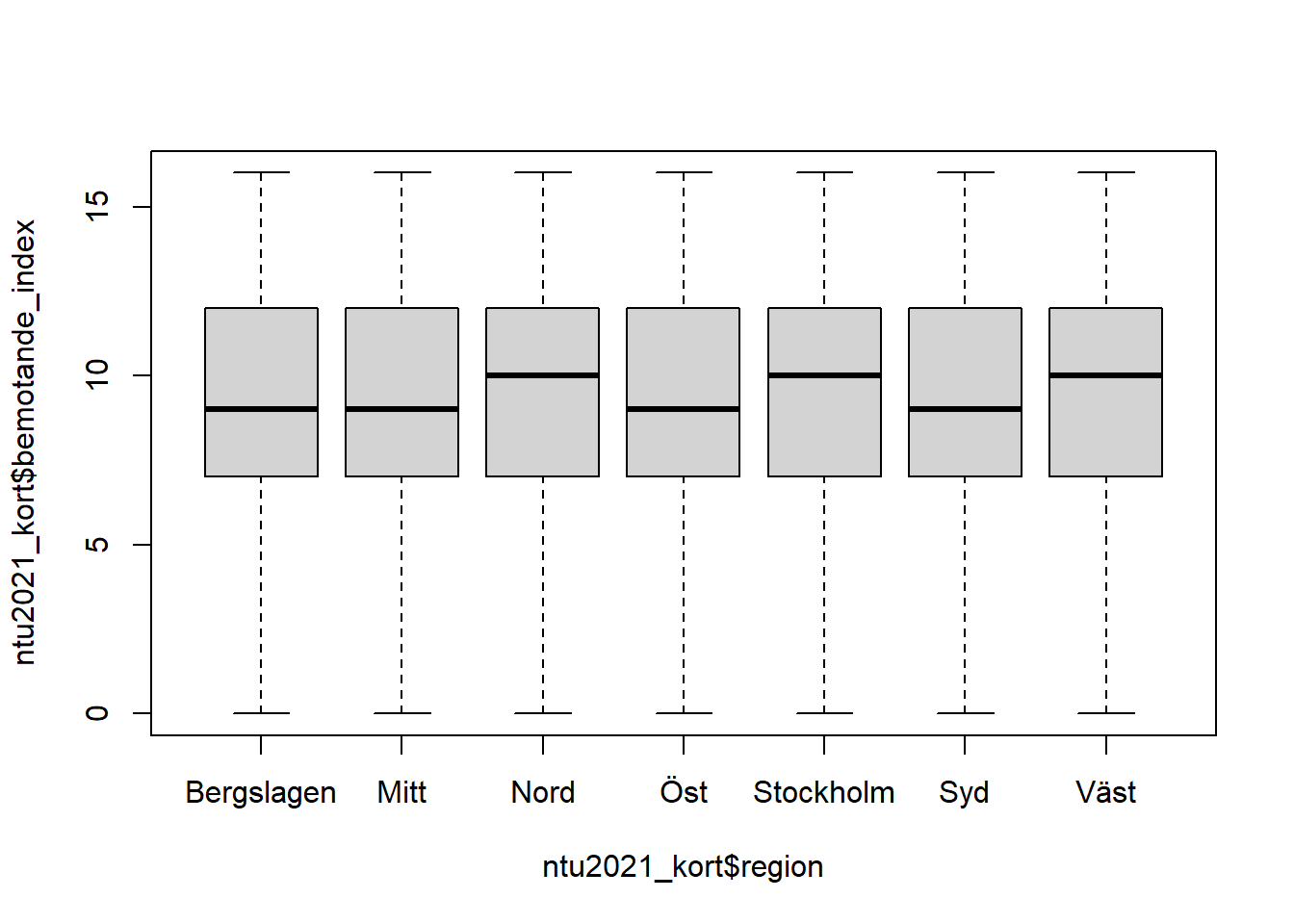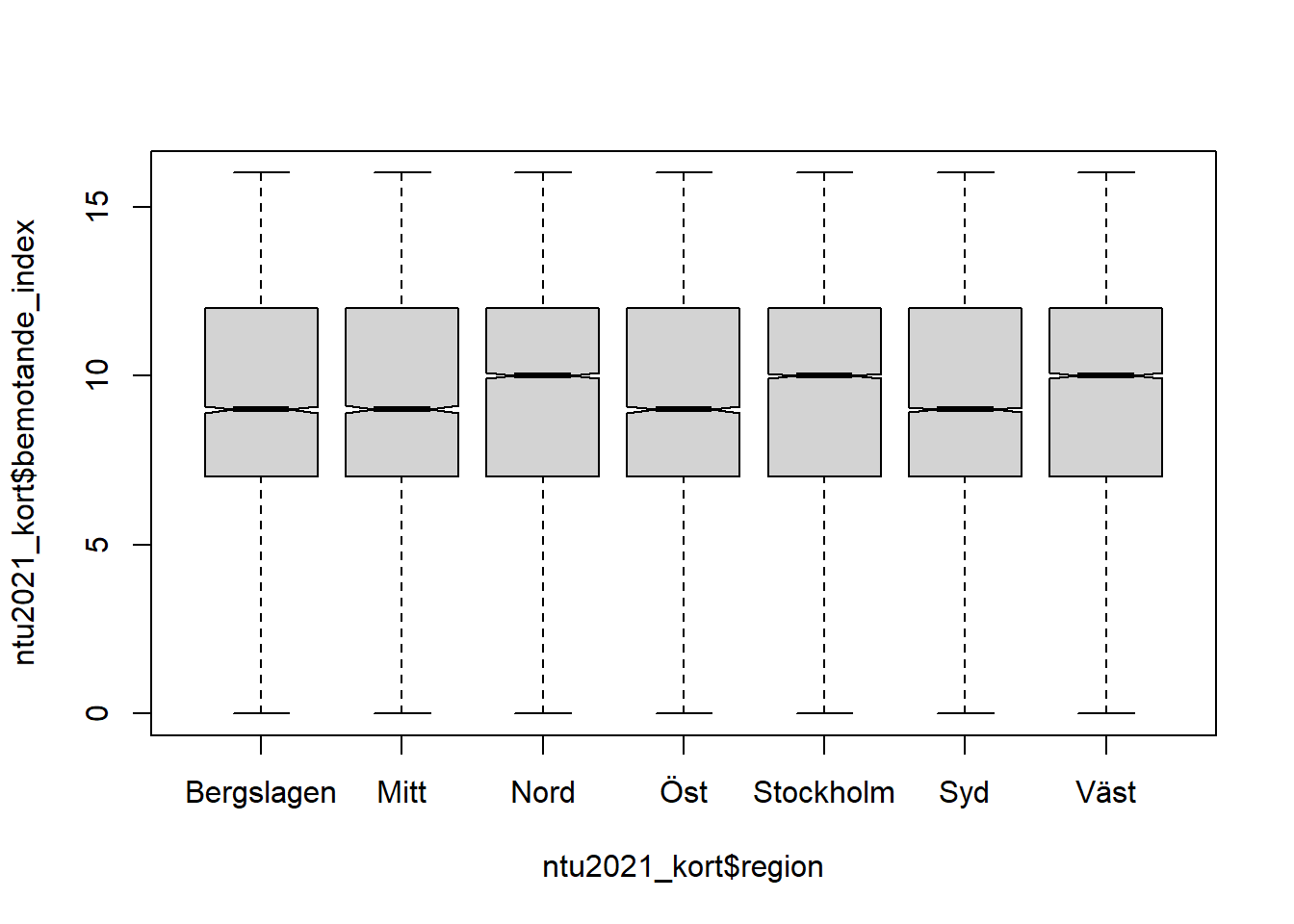 Vi kan alltså börja utforska om det är så att olika grupper skiljer sig åt eller har ser likadana ut i det förtroende som de uppvisar för rättsväsendets bemötande. Det gör vi genom att skriva in två variabler, skilda av ett “tilde”-tecken ~. Om vi exempelvis vill se hur förtroendet ser ut i olika polisregioner kan vi skriva följande kod: