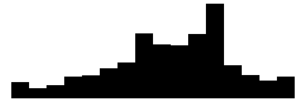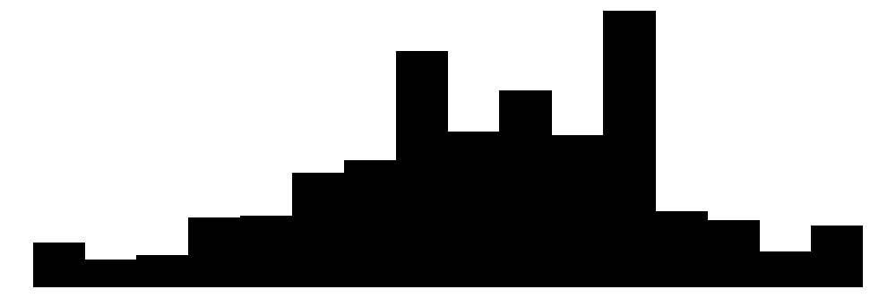 Histogram är ett typ av diagram som vi använder för att inspektera hur kontinuerliga variabler (alltså variabler på intervall eller kvotskala, i R datatyperna double eller integer) fördelar sig. De liknar stapeldiagram i viss utsträckning i det att de anger frekvens/antal observationer på den hvertikala y-axeln och variabelvärden på den horisontella x-axeln. Någonting att notera är dock att alla staplar angränsar varandra, vilket visuellt är tänkt att symbolisera att dessa variabelvärden är en kontinuerlig skala och inte tydliga kategorier.