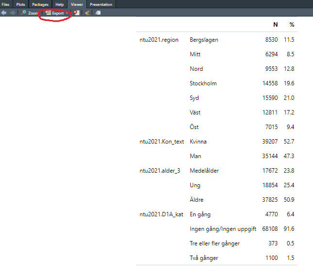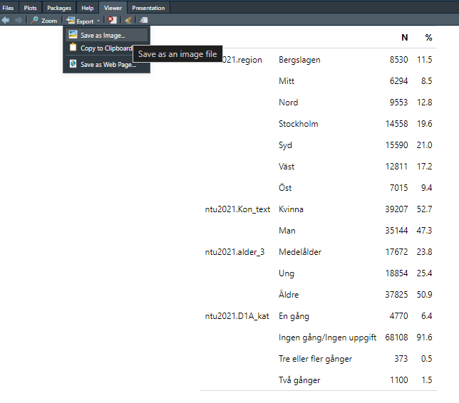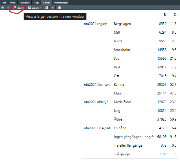 I fliken Viewer så får vi då upp en bild på en tabell där vi längst till vänster ser namnen på våra variabler (exempelvis ntu2021.region), därefter de variabelvärden som dessa variabler kan anta (exempelvis Berglslagen och Mitt), därefter ser vi en kolumn som heter “N” vilket står för antal och alltså anger antal observationer som har detta värden (hur många av de som svarat på enkäten som bor i polisregion Bergslagen), och sist en kolumn som heter “%” vilken motsvarar procent (hur många procent av alla svaranden som bor i Bergslagen: 11.5%).