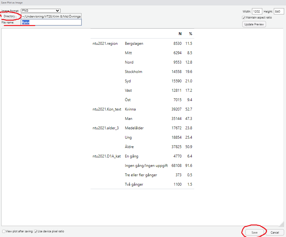 Spara tabellen som en bild genom att (1) klicka på Export och (2) välja Save as image och (3) i pop-up-fönstret välja vart filen skall sparas (Directory), namnge filen i fältet Filename, och klicka på Save.