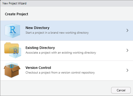 Skapa ett nytt projekt genom att i menyfliksområdet längst upp till vänster i RStudio klicka på File sedan New Project... och välj sedan New Directory i det pop-up fönster som blir synligt.