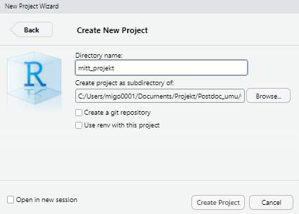 En användbar sak vi gör när vi arbetar i R är att vi skapar ett projekt där alla våra arbetsfiler länkas samman. Exempelvis våra data, våra skript där vi sparar alla kommandon, och våra resultat (om vi väljer att spara resultat som separata filer). En fördel med att skapa projekt är också att om vi lägger in datafiler i projektmappen så slipper vi skriva långa och krångliga sökvägar när vi skall läsa in data i R (det räcker då med filnamnet).