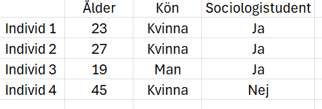 FALSEellerTRUE. - Data kan också vara kortare text (kalls i R för “Character”) så som “Kriminologi”, “Sociologi”, “Geografi”, eller “Gud vad jobbigt måste jag kunna allt det här?”, “Nej, inte på en gång, men det är bra att känna till det så kan du alltid gå tillbaka till det här avsnittet sen och kolla, efter att du har lärt dig lite mer och börjar känna dig bekväm”. Notera att text skrivs med “citattecken”.