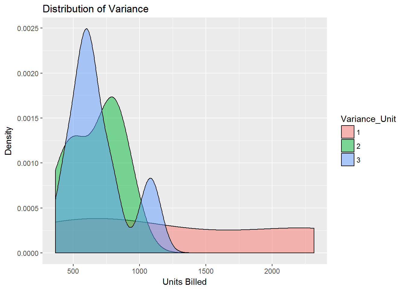 qplot(Units_Billed, data=sdata1, geom="density", fill=Variance_Unit, alpha=I(.5), main="Distribution of Variance", xlab="Units Billed",
