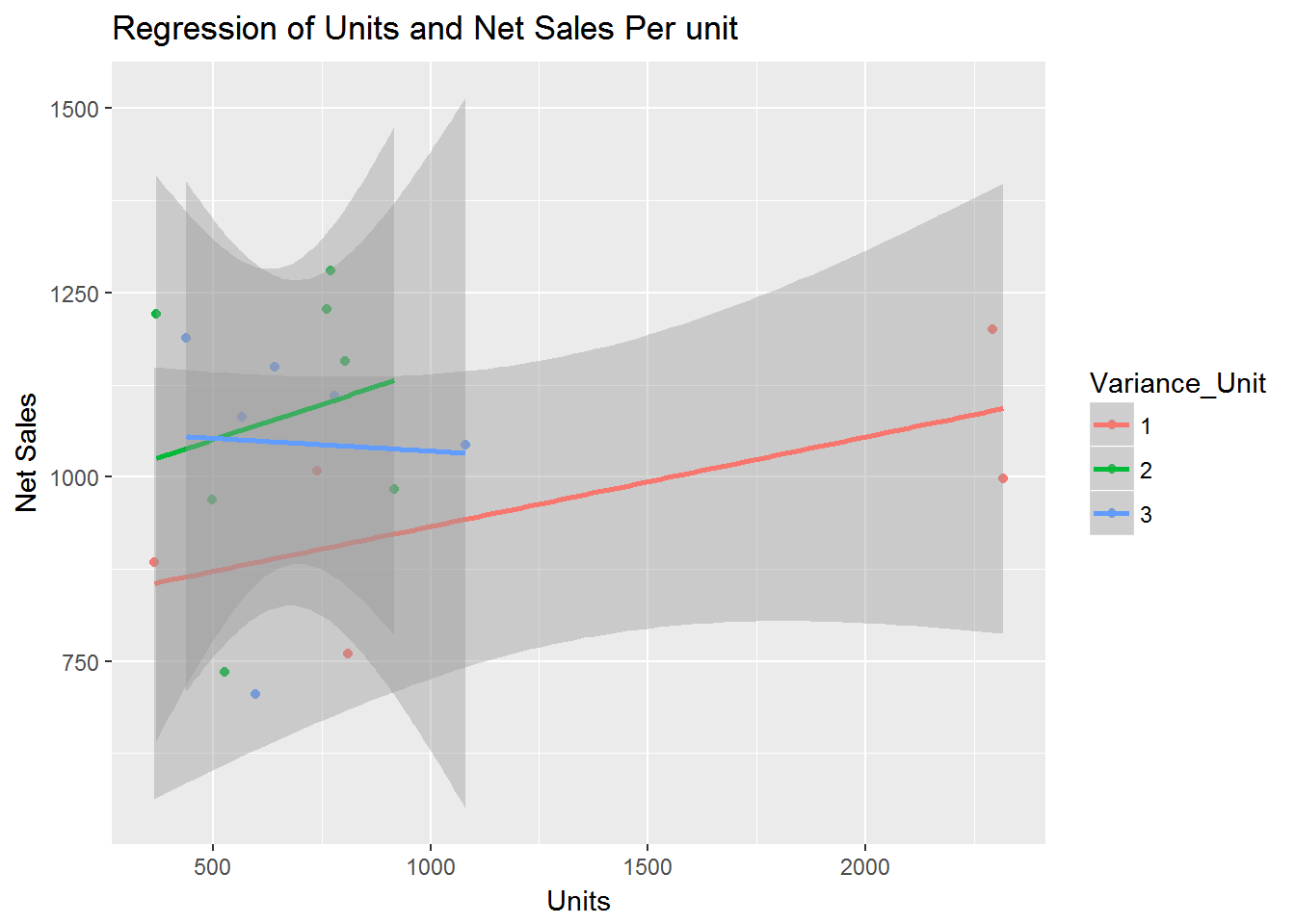 ####PSeparate regressions of Units_Billed on Net_Sales_Unit where Variance < 4 and Units < 5000