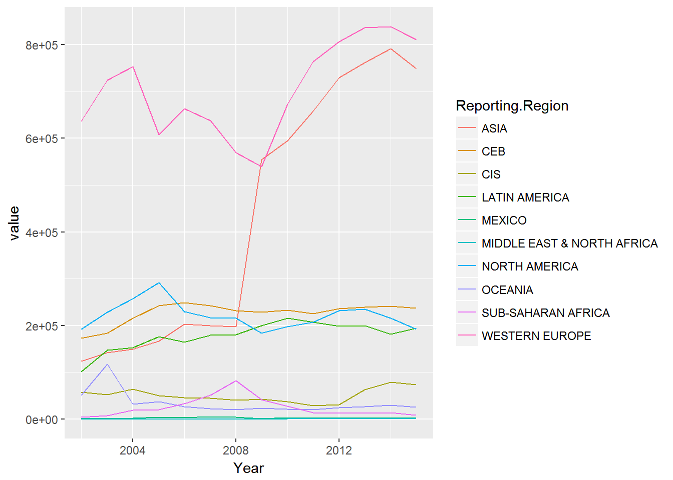 Let’s use the trade data set reviewed previously and plot the values by year for the reporting regions.