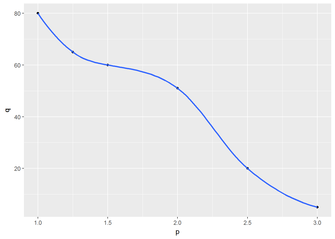 ggplot(df, aes(p,q)) + geom_point() + geom_smooth()## `geom_smooth()` using method = 'loess'