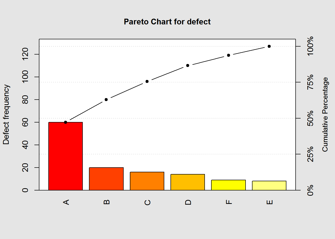 pareto.chart(defect, ylab = "Defect frequency", col=heat.colors(length(defect)))