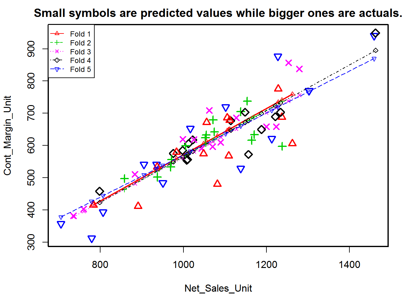 cvResults <- suppressWarnings(CVlm(data=sdata_full, form.lm=Cont_Margin_Unit ~ Net_Sales_Unit, m=5, dots=FALSE, seed=10, legend.pos="topleft", printit=FALSE, main="Small symbols are predicted values while bigger ones are actuals.")); # performs the CV