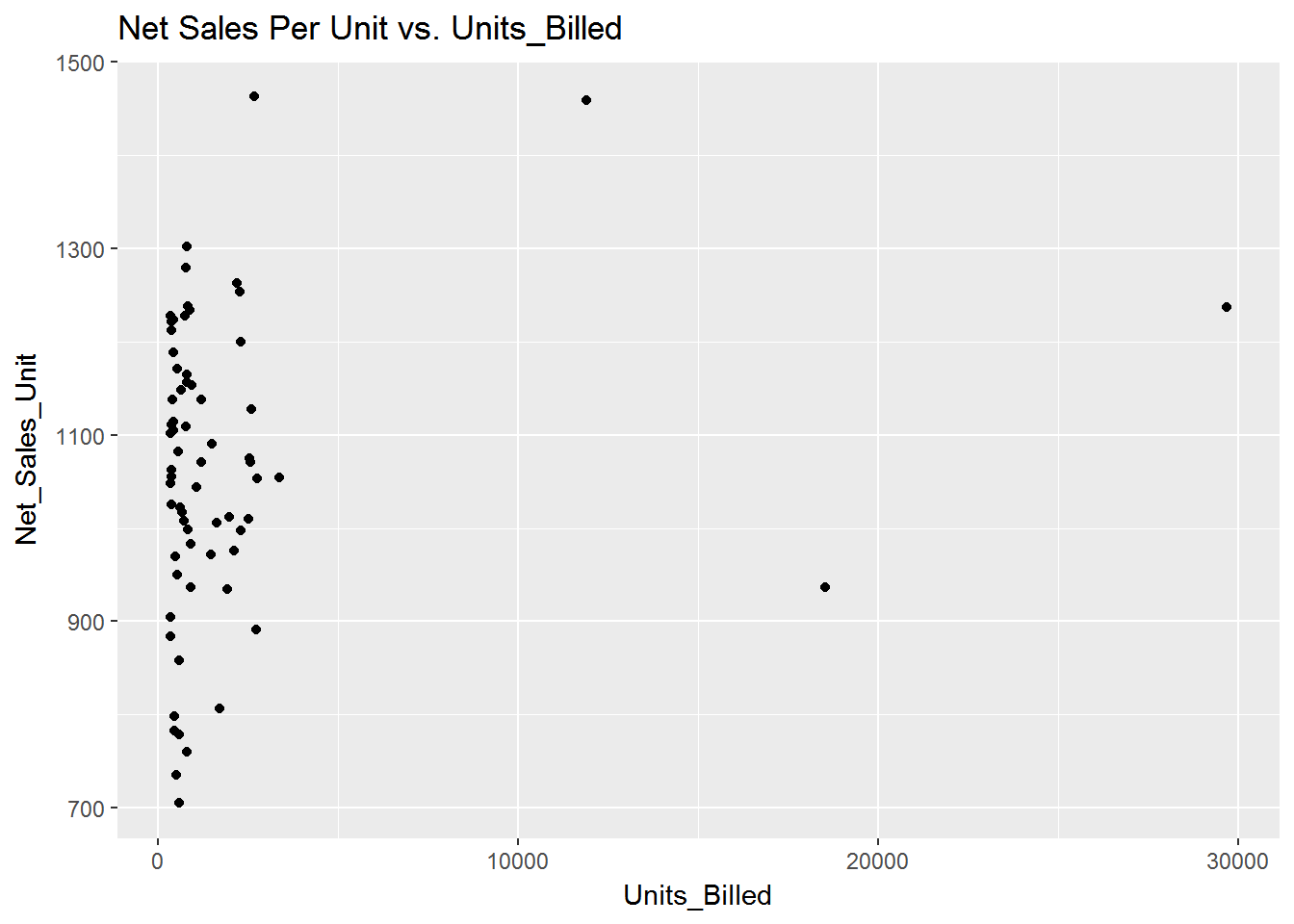 qplot(Units_Billed, Net_Sales_Unit, data=sdata, main="Net Sales Per Unit vs. Units_Billed")