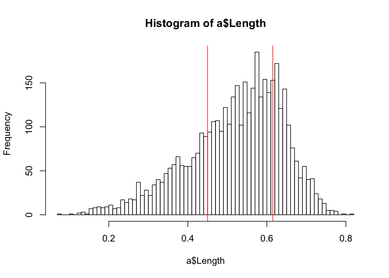 hist(a$Length, plot=F)[[1]]## [1] 0.05 0.10 0.15 0.20 0.25 0.30 0.35 0.40 0.45 0.50 0.55 0.60 0.65 0.70