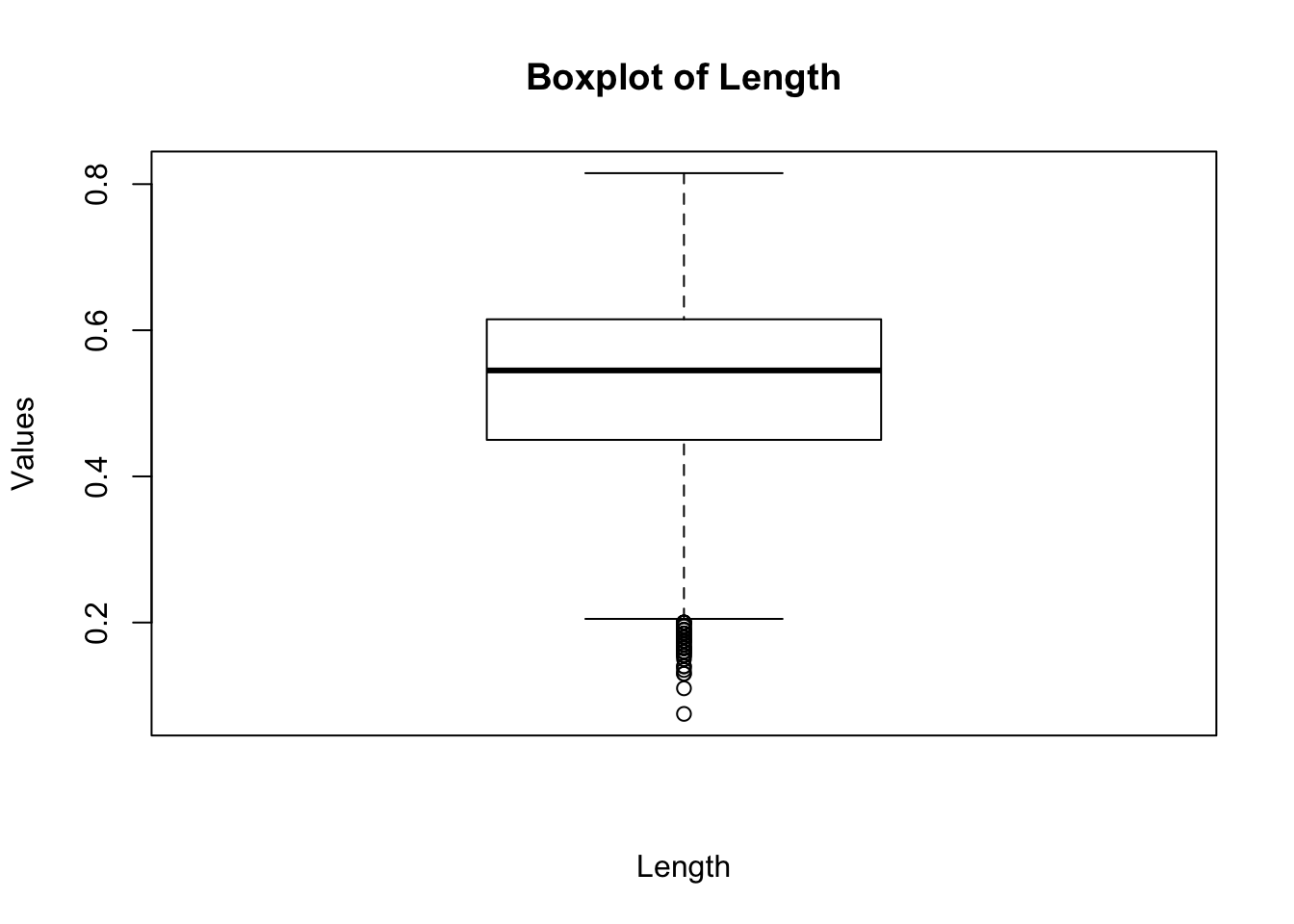 boxplot(a$Length, main="Boxplot of Length", xlab="Length", ylab="Values")