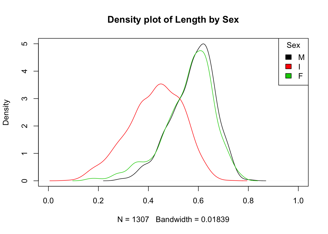"Density plot of Length by Sex: \n I (green), M (black), F (green)")