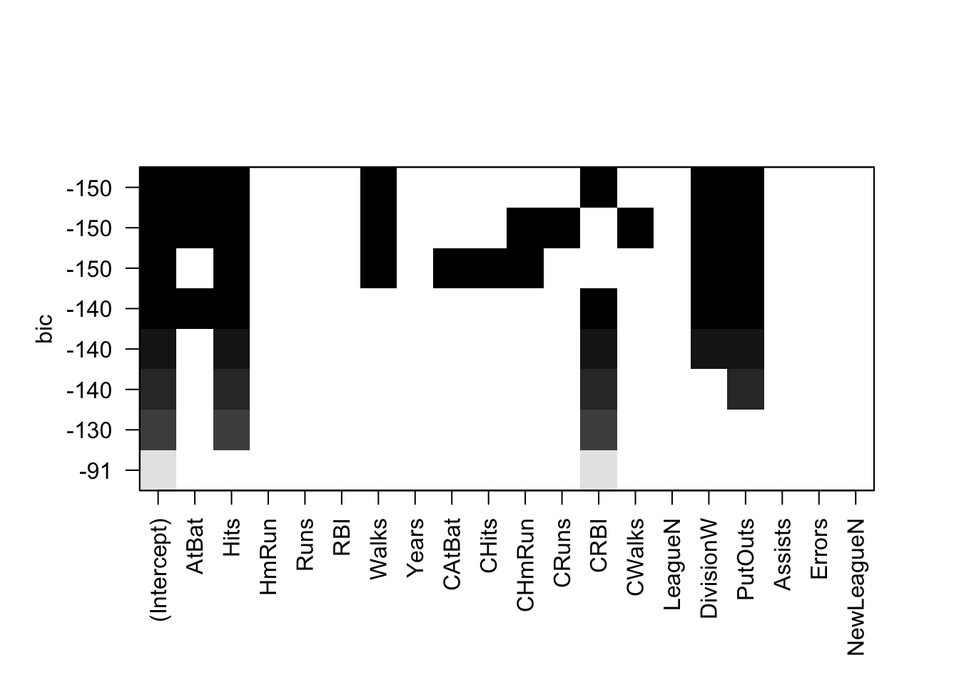 display(step(lm(Salary ~ ., data = Hitters), trace = F, direction = "forward"))## lm(formula = Salary ~ AtBat + Hits + HmRun + Runs + RBI + Walks +