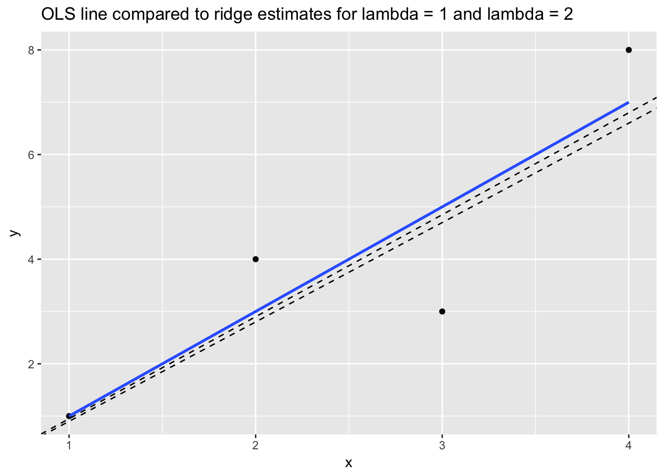 The possible values for \(\hat\beta\) will touch the corners of the square (will equal 0) in the case of lasso, but never for ridge: the constraint will always intersect the possibilities for \(\hat\beta\) at some non-zero point.