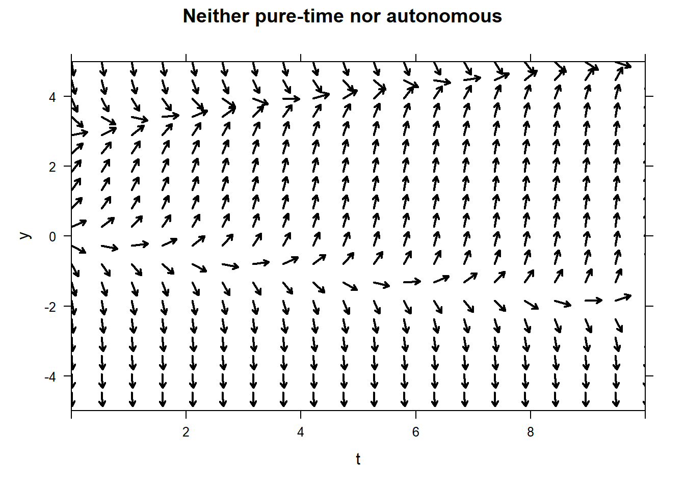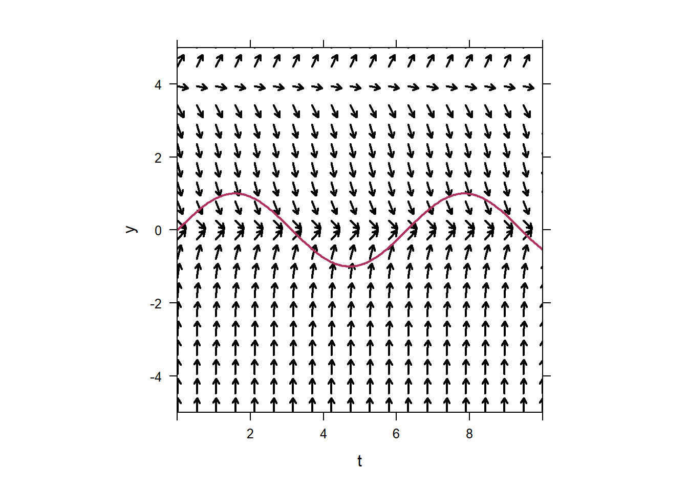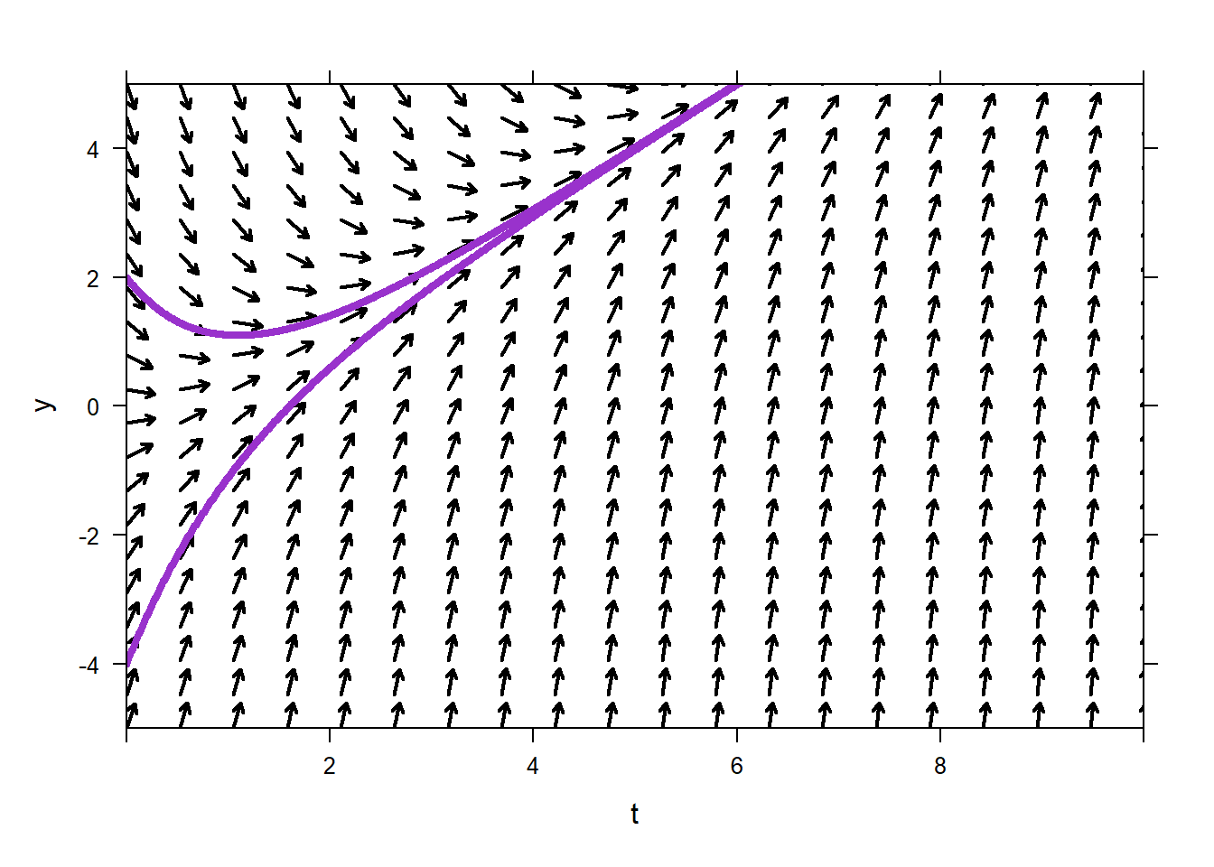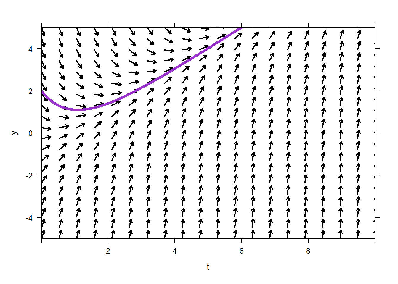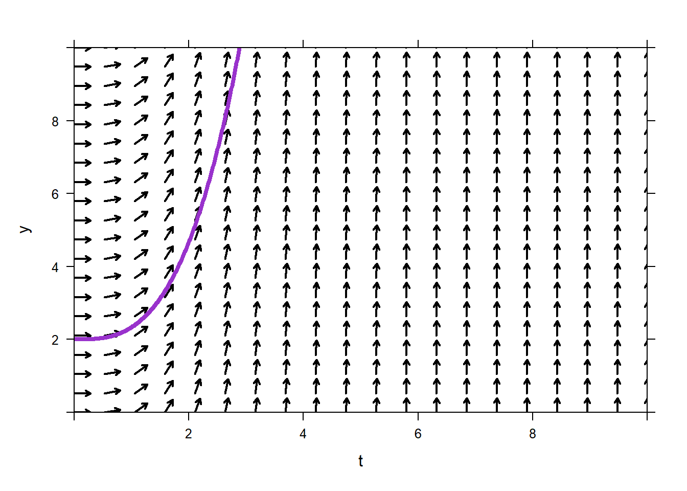 plotODEDirectionField(t-y~t&y,tlim=c(0,10),ylim=c(-5,5),ics=2)