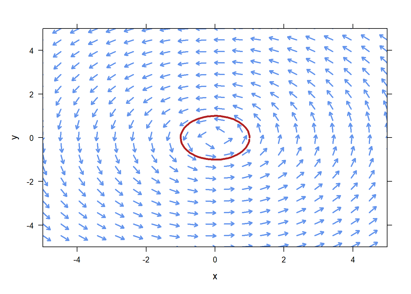 For the system of ODE \[\begin{aligned} &x'=-y\\ &y'=x\\ \end{aligned}\] we can plot the phase plane as below.