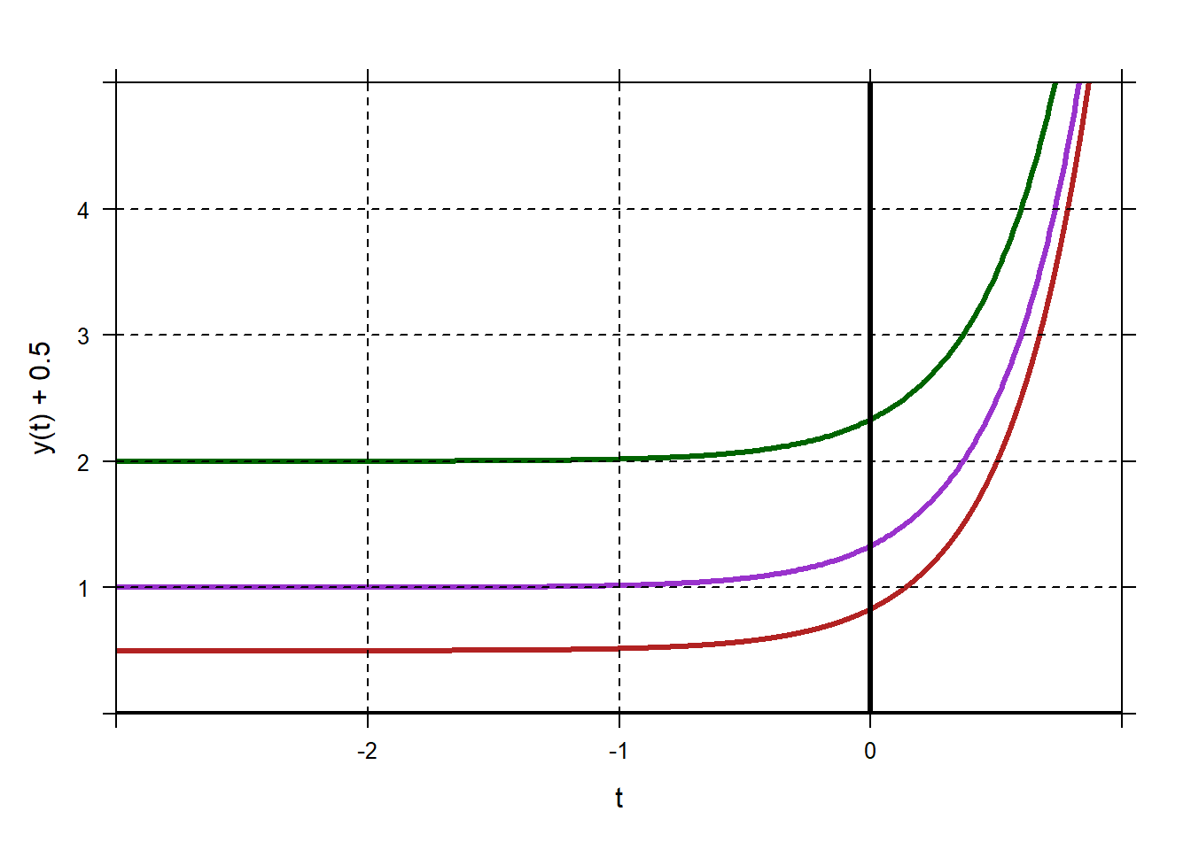 You can vary the arrow thickness and color using lwd and col, as usual. You can plot trajectories that correspond to initial conditions as follows. You can plot one or many trajectories. It is assumed that the initial condition always occurs on the left-hand side of the figure, so you only need to give the \(y\)-value of the initial condition(s).
