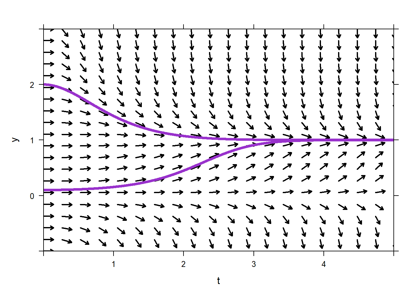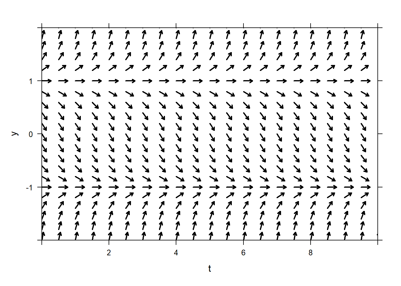 plotODEDirectionField, note that the behavior of this ODE does not vary based on \(t\). Using \(N=21\) as an option puts arrows right on the equilibrium solution. It will look ok if you omit that option.