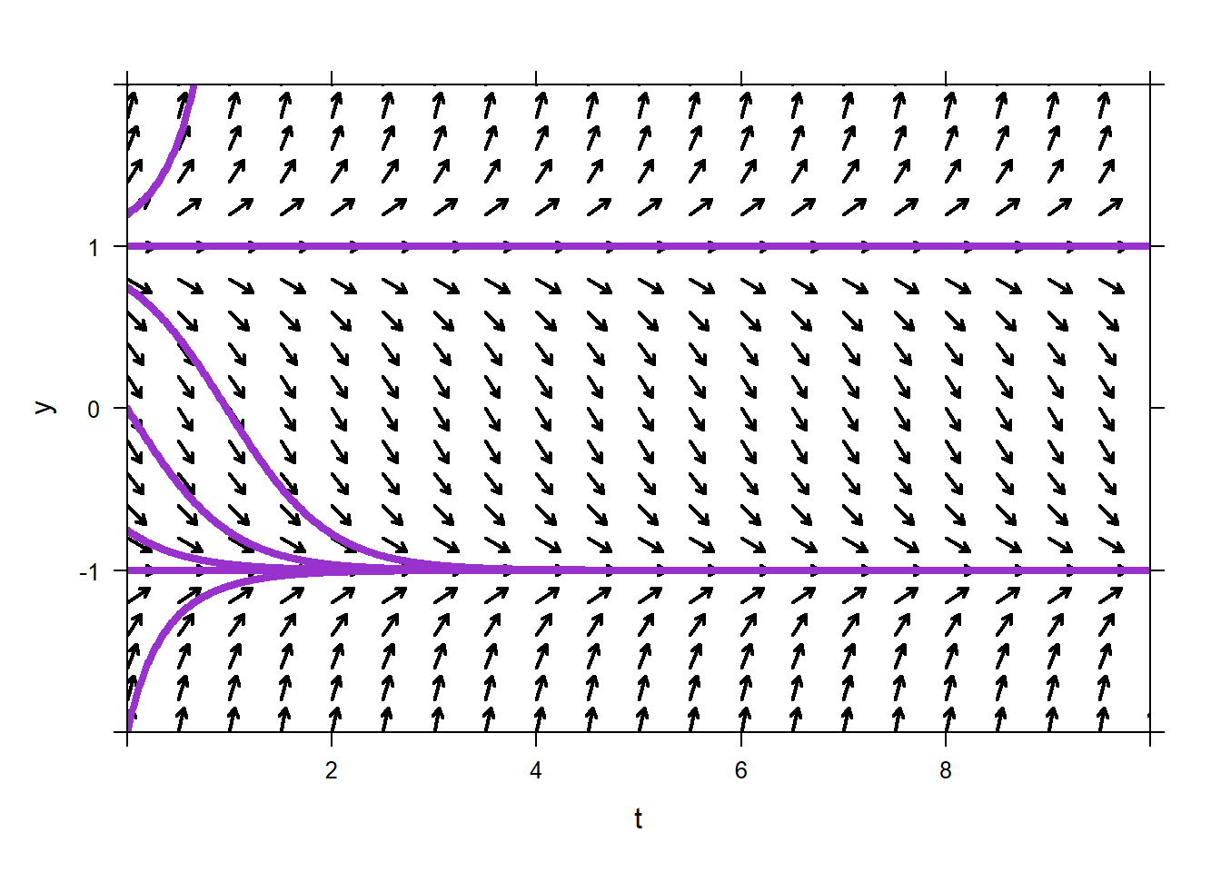 ## y ## 1 -1 ## 2 1There are two types of equilibrium solutions we’ll discuss for autonomous ODEs: stable and unstable. An equilibrium solution is stable if solutions starting nearby stay nearby (doesn’t go to another equilibrium solution, nor \(\pm \infty\). Similarly, an equilibrium solution is unstable if nearby solutions veer away from that equilibrium. Using our example, have the cadets classify \(y = - 1\) and \(y = 1\).