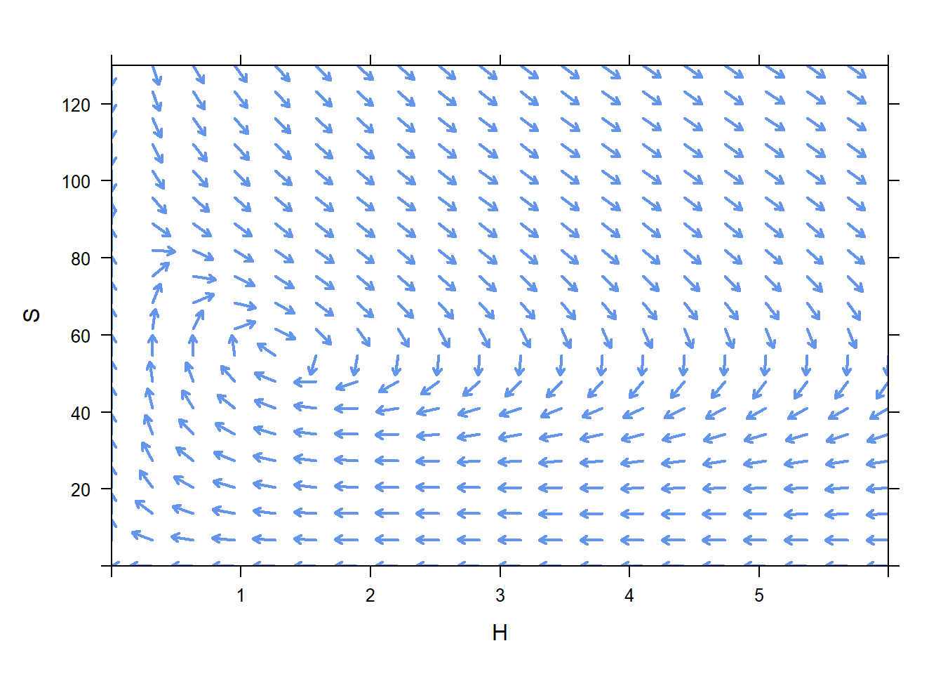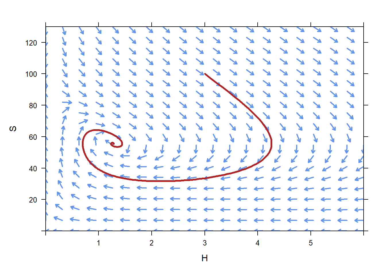 Once you have a phase plane in mind, ask how the populations might evolve if the initially start at \(H=3\), \(S=100\)? Just like a direction field, the solution will “flow along” the arrows. This is a place where I would project the phase plane on the board, draw a big dot at position \(H=3\), \(S=100\), and then have them tell me how to flow along the directions.