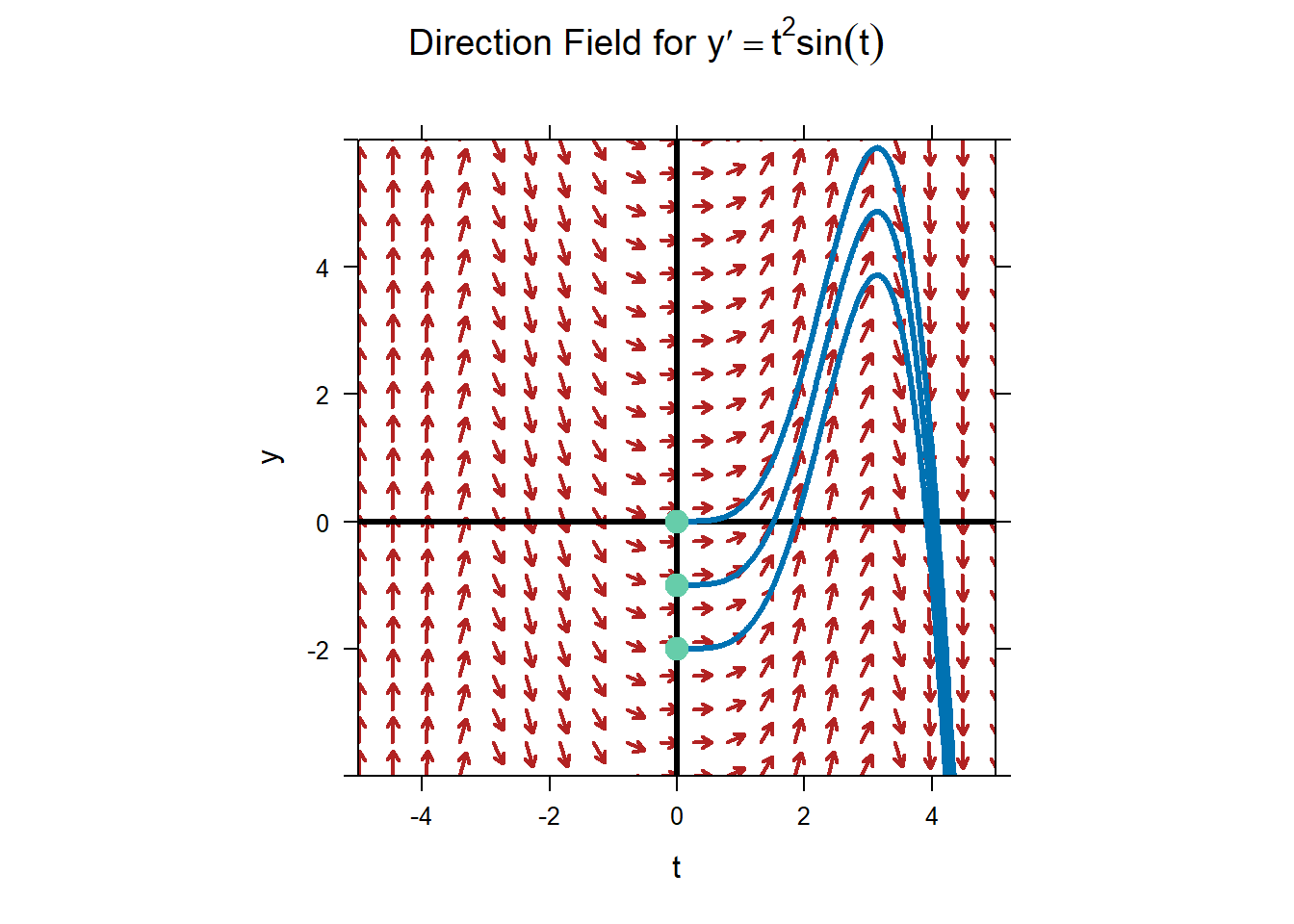 The next picture shows the solutions for the ODE \[y^{'} = t^{2}\sin(t)\] with the initial conditions: \[y(0) = 0,\, y(0) = - 1,\text{and }y(0) = - 2.\] Notice that we also represent these initial conditions as points: \((0,0)\), \((0, - 1)\), and \((0, - 2)\), respectively.