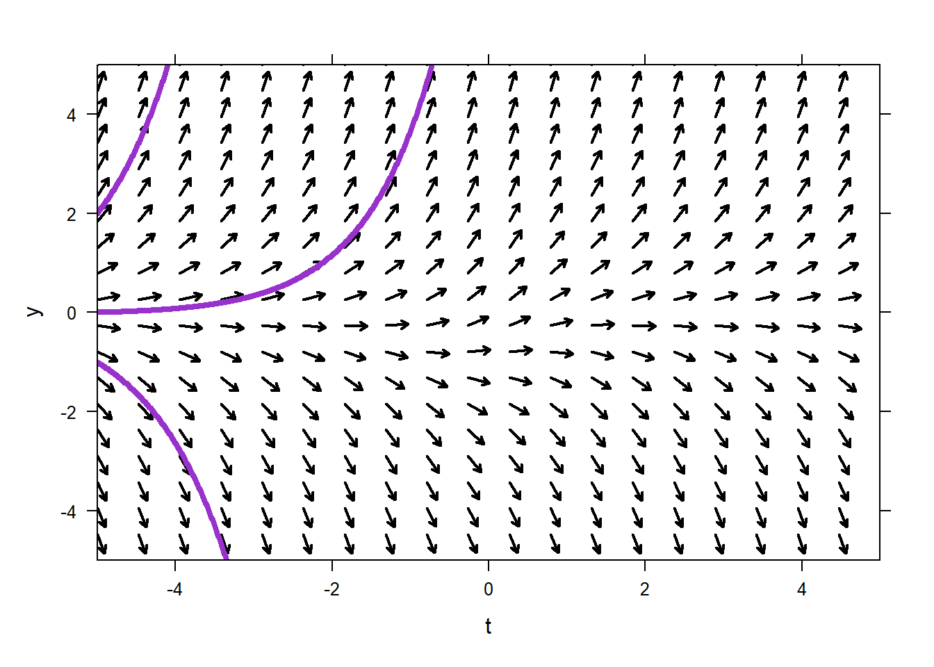This differential equation is pure-time, because \(y'\) depends only on \(t\), not on \(y\). We can see that the direction field for the ODE does not vary in the \(y\)-direction.