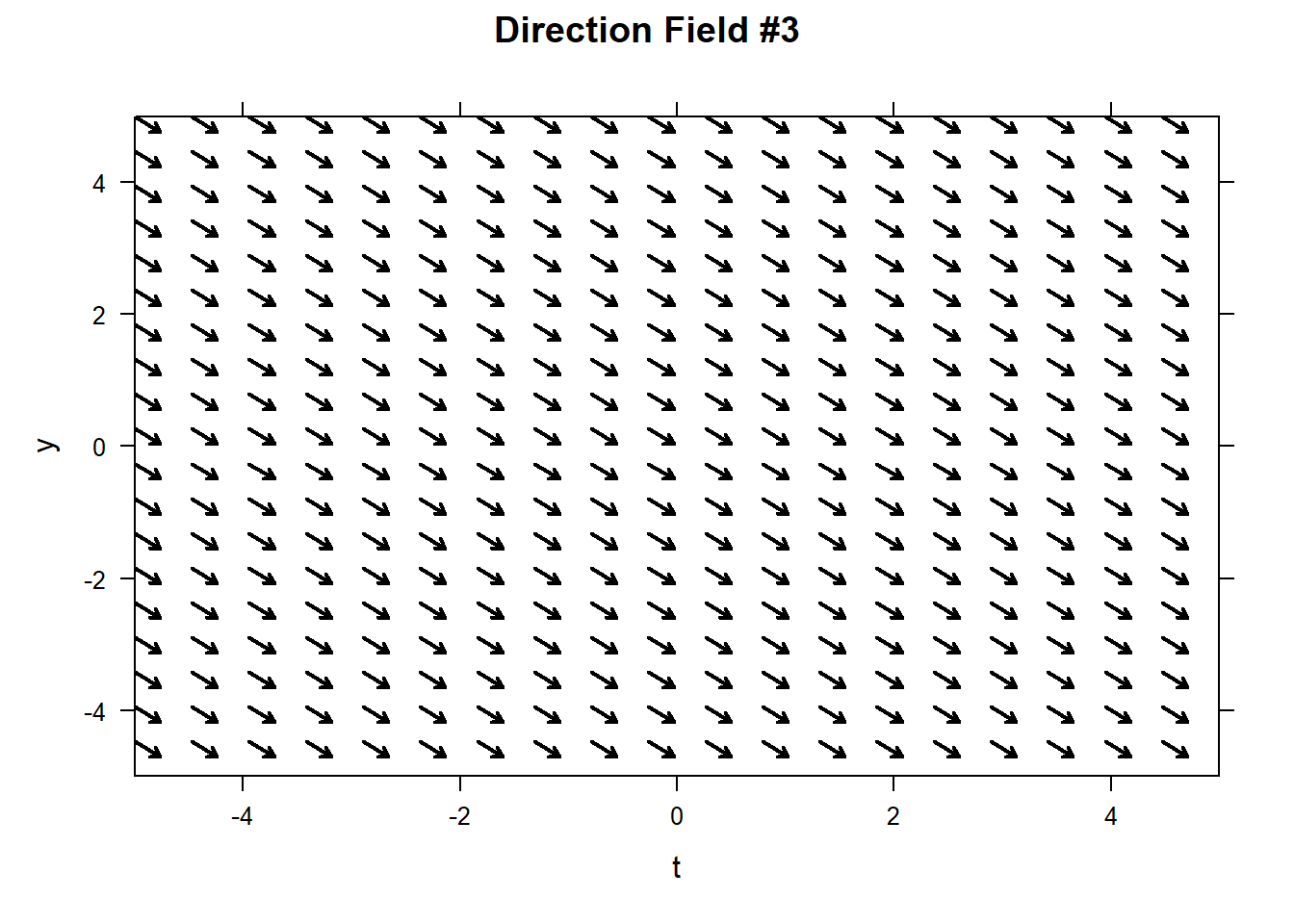 Often the slope vectors vary significantly in magnitude, as seen above, and the resulting slope field plot is difficult to interpret. To avoid this situation we commonly use a direction field which scales all of the direction vectors to have the same length. A direction field also shows the slope of solutions to the ODE as they pass through the base points of the vectors in the slope fields, but direction fields scale all the vectors to have the same length.