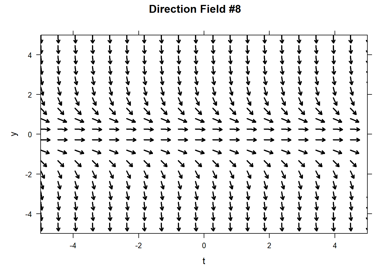 First, we can see that the direction field does not vary in the \(t\)-direction, so the corresponding ODE must be autnonomous. Therefore, the direction field does not correspond to #1.