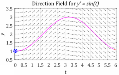 Given the initial condition \(y(0) = 1\), we consider the flow of a ball along the “river” created by the direction field. Our approximation of this flow can be seen here. This is exactly the same as we discussed in Section 3. The question is this: how did we approximate the flow of the solution along the direction field?